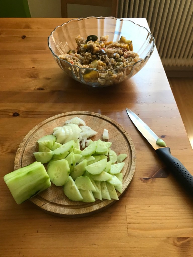 Gestern musste es mit dem Mittagessen schnell gehen, also habe ich einfach nur ein paar Dinge zusammen geworfen, die ich daheim hatte. Verschiedene Sommer Gemüse angebraten in der Pfanne und vermischt mit Bulgur und Quinoa. Obwohl wir richtig rein gemampft haben, ist leider jede Menge übrig geblieben. Da ich kein Essen verschwenden möchte, habe ich dann heute einfach einen mediterranen Salat daraus gemacht.