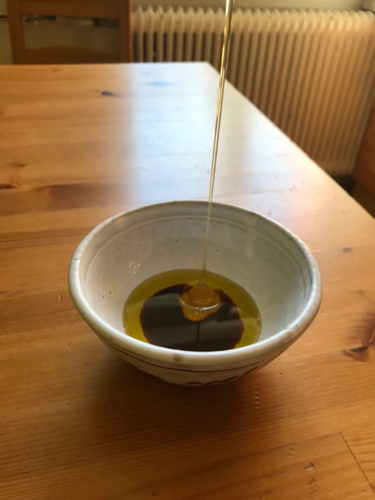 Ich habe ein einfaches Olivenöl – Balsamico – Honig Dressing mit Salz und Knoblauch gemacht. Dazu gabs dann gebratenen Halloumi.