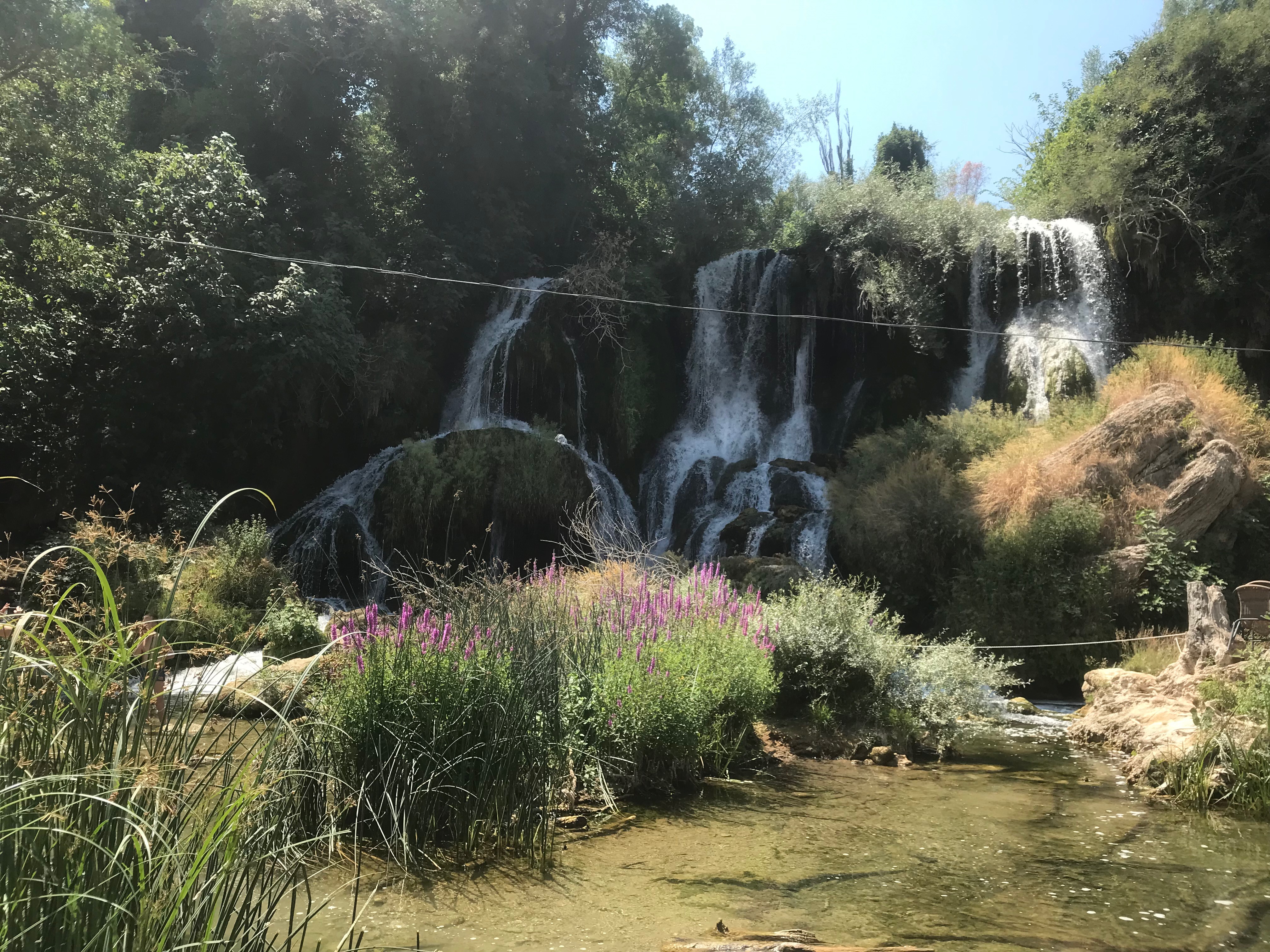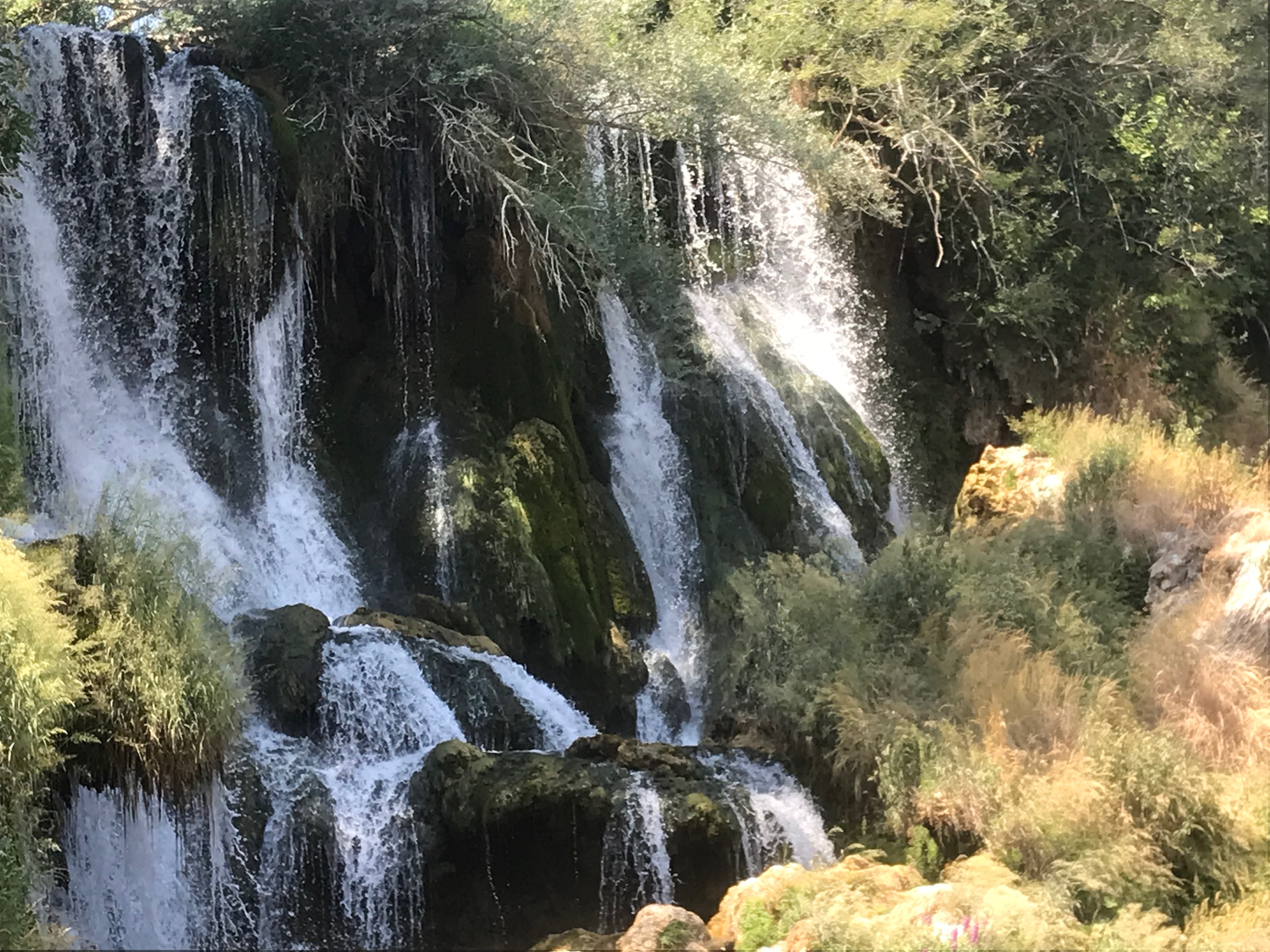 Die Kravica Wasserfälle sind eine Touristenattraktion, der Parkplatz ist voll, es gibt auch viele Reisebusse. Der Eintritt kostet 20 KM für Erwachsene, Kinder bis 7 Jahre zahlen nichts. Nach dem Eingang führen Treppen bergab, für Menschen, die nicht so gut zu Fuß sind, steht ein kleiner Zug bereit. Die Wasserfälle sind wunderschön und in dem riesigen Becken davor kann man wunderbar schwimmen und sich abkühlen. Es ist aber wirklich sehr voll, auch laut und von den zahlreichen Restaurants wehen alle möglichen Gerüche um unsere Nasen. Die Kinder haben sehr viel Spaß und die 7-Jährige freundet sich mit einem Gleichaltrigen an. Er ist ganz erfreut, dass er ein deutschsprechendes Kind gefunden hat.