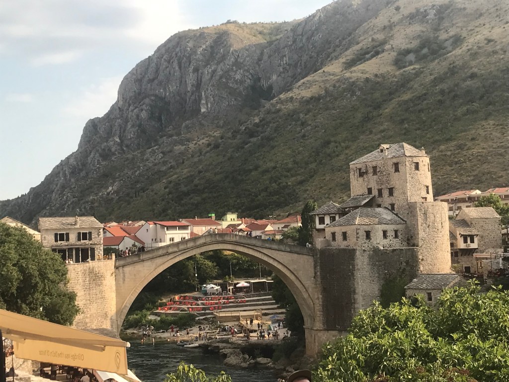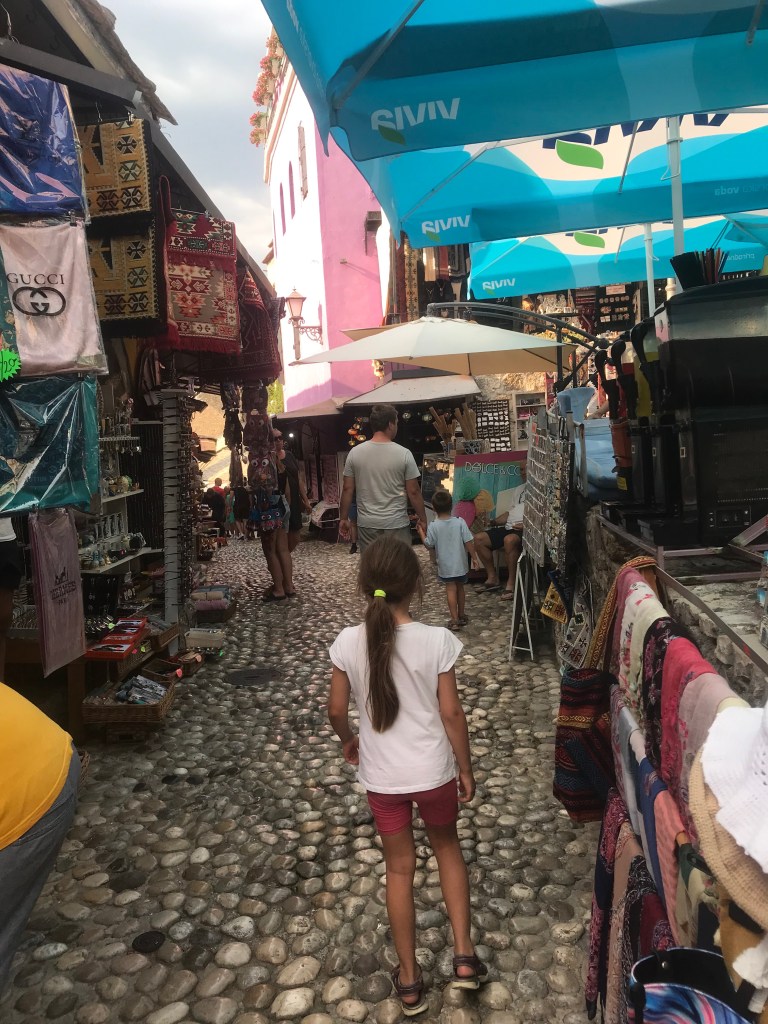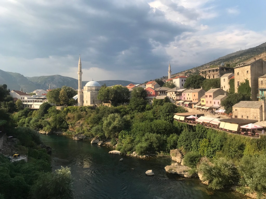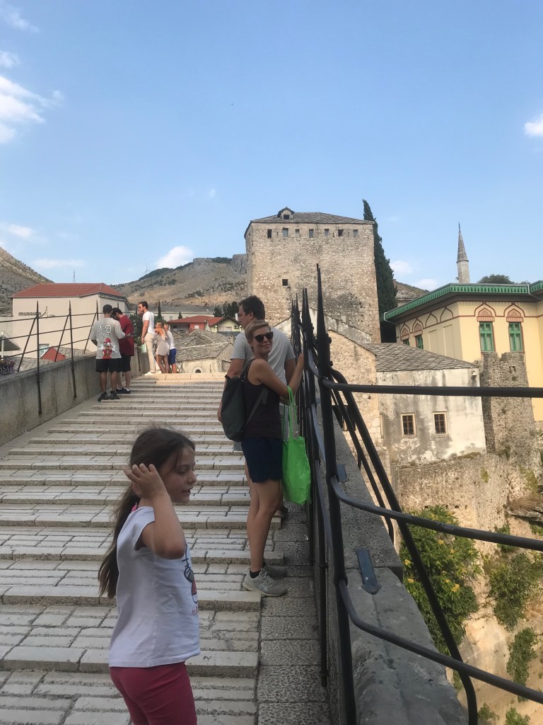 Gegen 13:30 brechen wir wieder auf. Das Außenthermometer am Auto zeigt 43 Grad an. Wir fahren weiter nach Mostar, unser Zwischenstopp auf dem Weg nach Sarajevo. Wir überlegen kurz, ob wir in Medjugorje stehen bleiben sollen, aber es ist einfach zu heiß. Unsere klimatisierte Unterkunft in Mostar liegt nur ein paar Minuten vom Stadtzentrum entfernt. Nach einer kurzen Rast spazieren wir ins Stadtzentrum. Wir haben vorab schon ein Lokal herausgesucht, das auch vegetarische und vegane Speisen anbietet. Das Essen ist fantastisch. Wir essen gefüllte Melanzani mit Kartoffeln, Pizza und Cevapi – himmlisch. Dann bummeln wir durch die Straßen, die ähnlich wie in Sarajevo auf beiden Seiten mit Handwerksläden gesäumt sind. Natürlich gehen wir auch über die berühmte Brücke, dort treffen wir zufällig das Deutsch sprechende Kind von den Kravica Wasserfällen wieder und wir unterhalten uns kurz mit den Eltern.