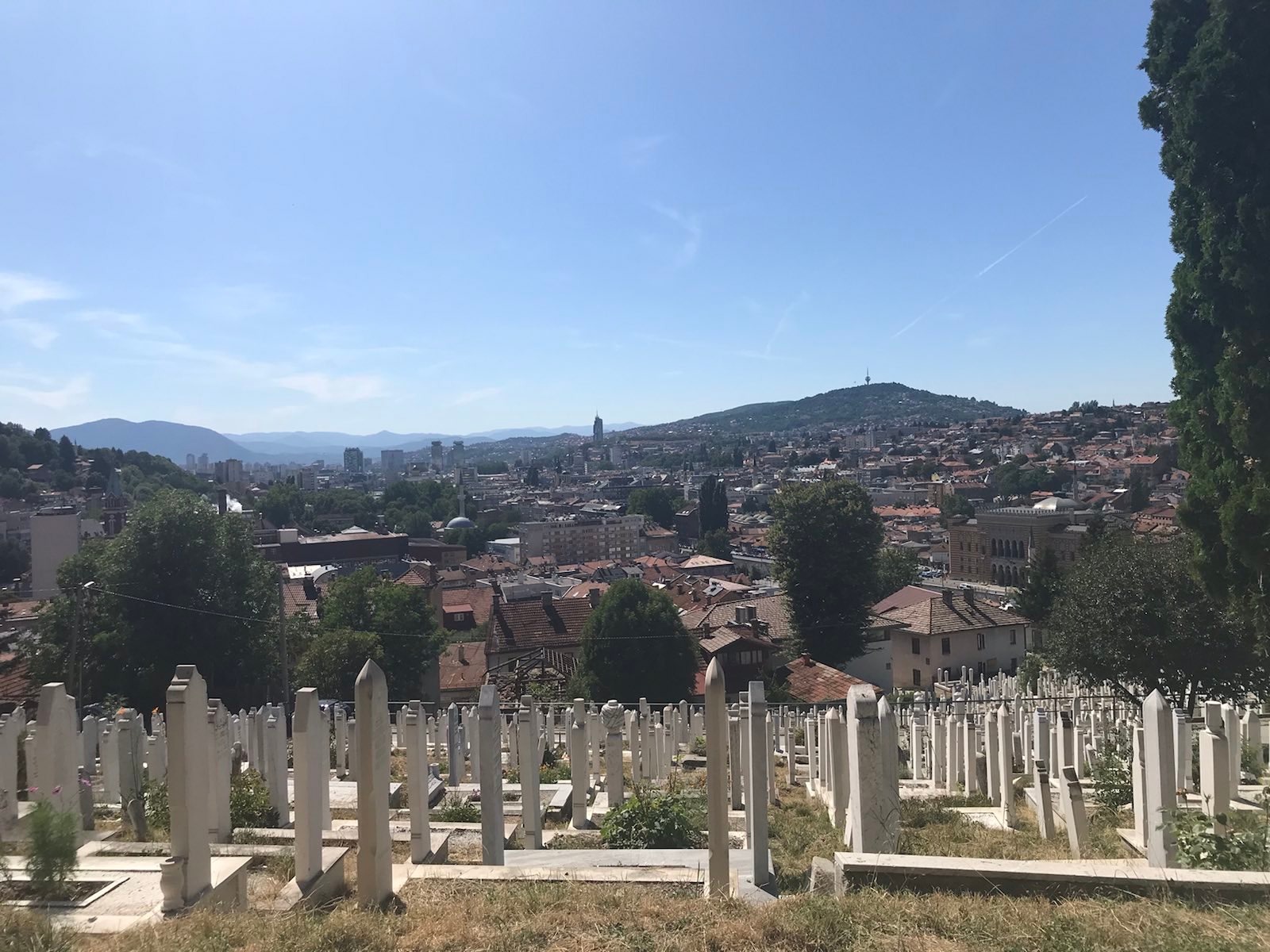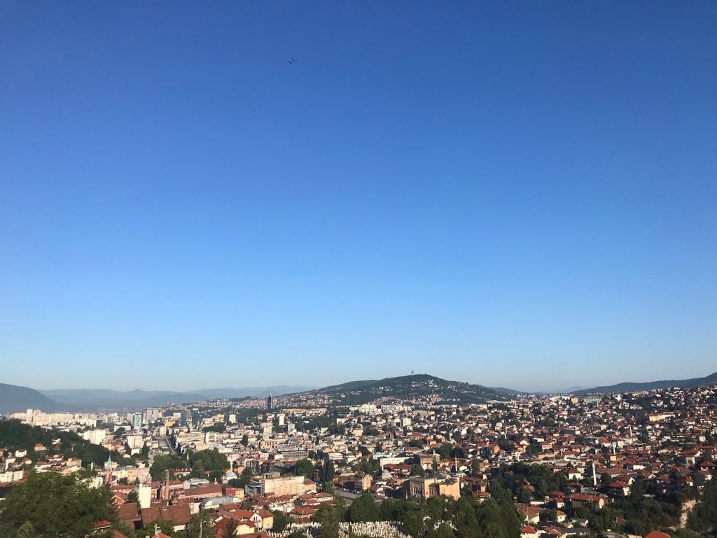 Am 18.7.2022 geht es los. Wir starten in Šid/Serbien. Unser erstes Ziel ist Sarajevo. Es ist sehr heiß und wir fahren zu fünft in einem kleinen Hyundai i30, wir sind drei Erwachsene und zwei Kinder. Wir wählen die Route an der serbischen Grenze entlang über die M19. Obwohl es nur etwa 250 km sind, brauchen wir für die Strecke knappe fünf Stunden. Es geht über kurvige Bergstraßen, bergauf und bergab. Autobahn gibt es keine. Die Strecke ist wunderschön und wir fahren durch kleine malerische Dörfer die mich teilweise eine bisschen an österreichische Almen erinnern. Als wir in Sarajevo ankommen erwartet uns noch eine kleine Herausforderung – unsere Unterkunft liegt am Berghang, die Straße dahin ist mehr als schmal, steil und kurvig – zum Glück haben wir ein kleines Auto. Mit einem tollen Ausblick auf die Stadt unter uns werden wir belohnt.