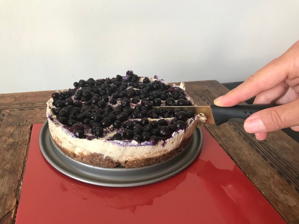 Dann kommt der Cheesecake in den Kühlschrank. Je länger er steht, desto besser und fester wird er. Wer möchte, kann noch frische oder gefrorene Früchte drauf tun. Ich habe ihn mit gefrorenen Heidelbeeren getoppt. Ich habe auch schon mal mit geriebenen Karotten getoppt, dann ist es ein Carrot Cheesecake.