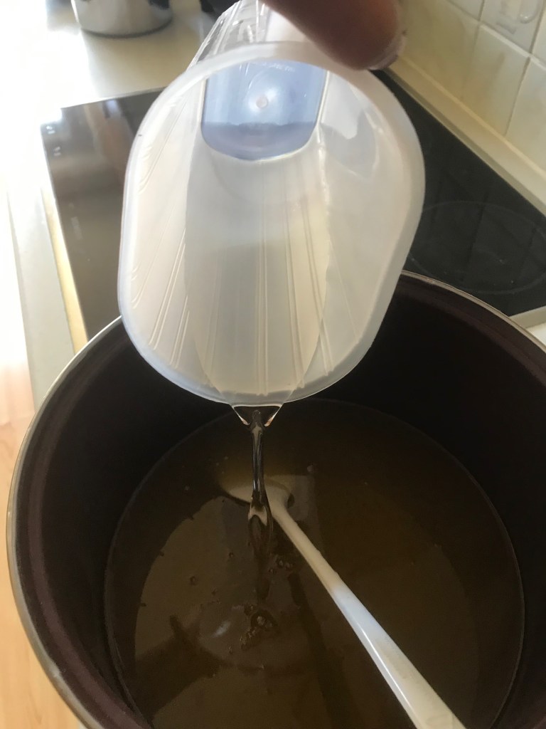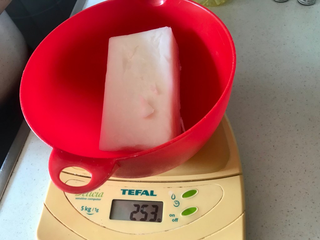 Die heutige Seife besteht ganz schlicht aus Kokosöl, Pflanzenmargarine und Rapsöl, dazu die Lauge (Ätznatron und Wasser). Ich schreibe hier absichtlich keine genaue Anleitung – wer Interesse an der Seifenherstellung hat, soll sich bitte ein gutes Buch dazu kaufen oder sich im www informieren. Oder mir eine Nachricht schreiben. Ich gebe mein Wissen gerne weiter.