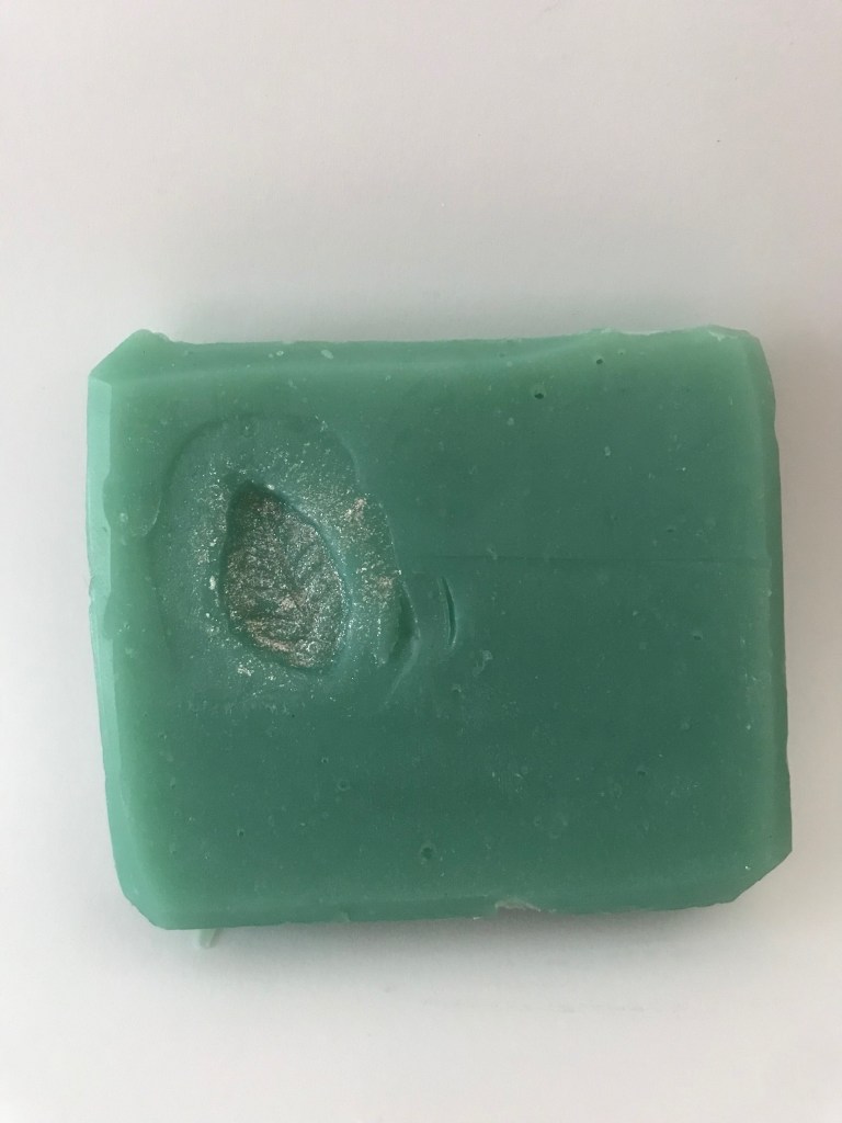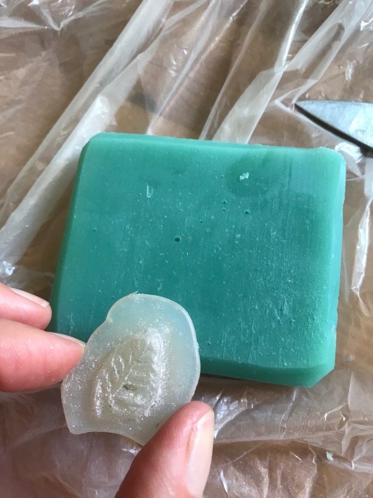 Die Stempel habe ich vor Jahren selbst gemacht. Ich habe für diese Frangipani-Seife ein schlichtes Blatt und einen Fisch zum Stempeln verwendet.