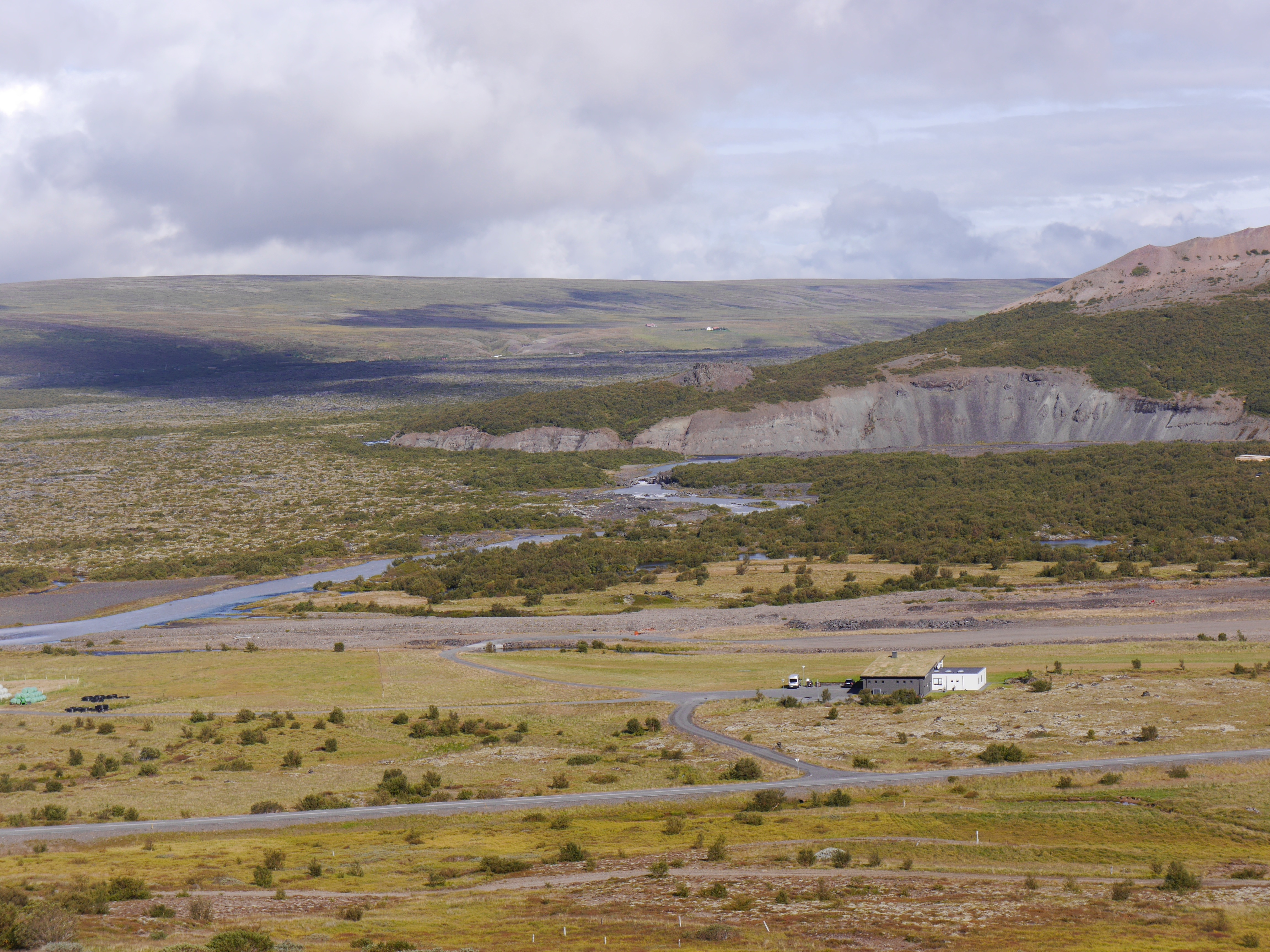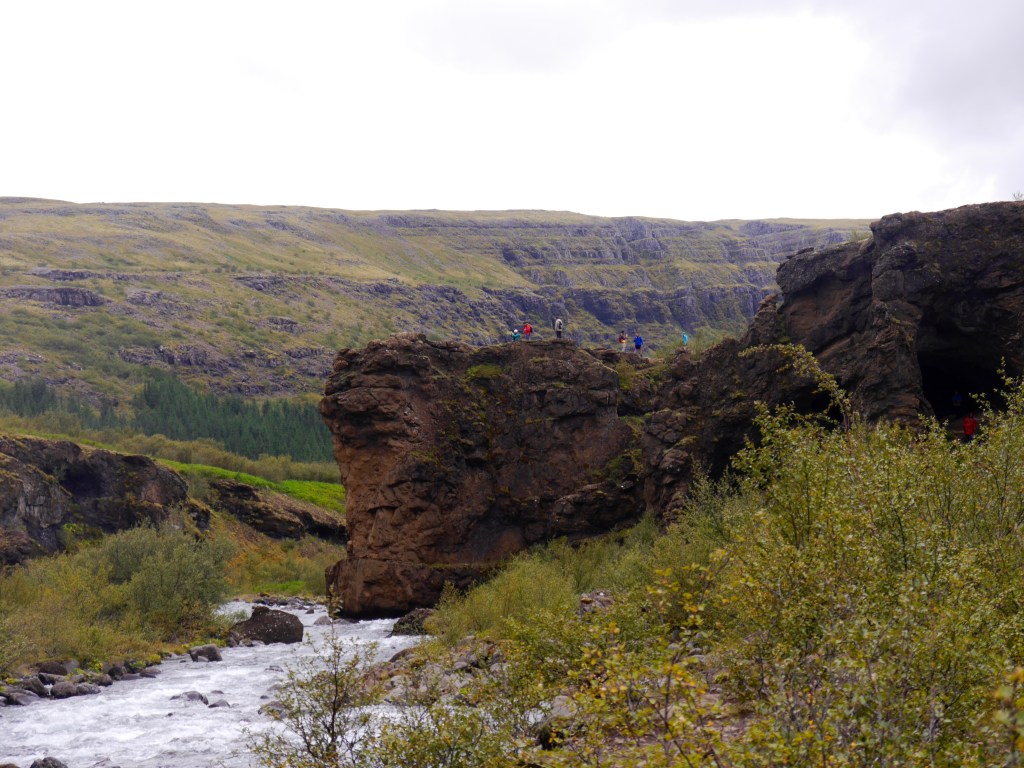 Sehr beeindruckend! Trotz Regen sind hier sehr viele Menschen unterwegs. Wir lieben ja mehr die Einsamkeit und so fahren wir, nachdem wir uns satt gesehen haben, dann auch schnell weiter nach Húsafell. Hier soll es gute Wandermöglichkeiten geben und wirklich, es ist zwar ein kleiner und überschaubarer Ort, im Informationszentrum gibt es aber kleine Wanderkarten. Wir starten eine Wanderung mit einem für mich unaussprechlichen Namen. Mittlerweile hat es zu Regnen aufgehört und die Sonne kommt hervor. Keine Menschen weit und breit.
