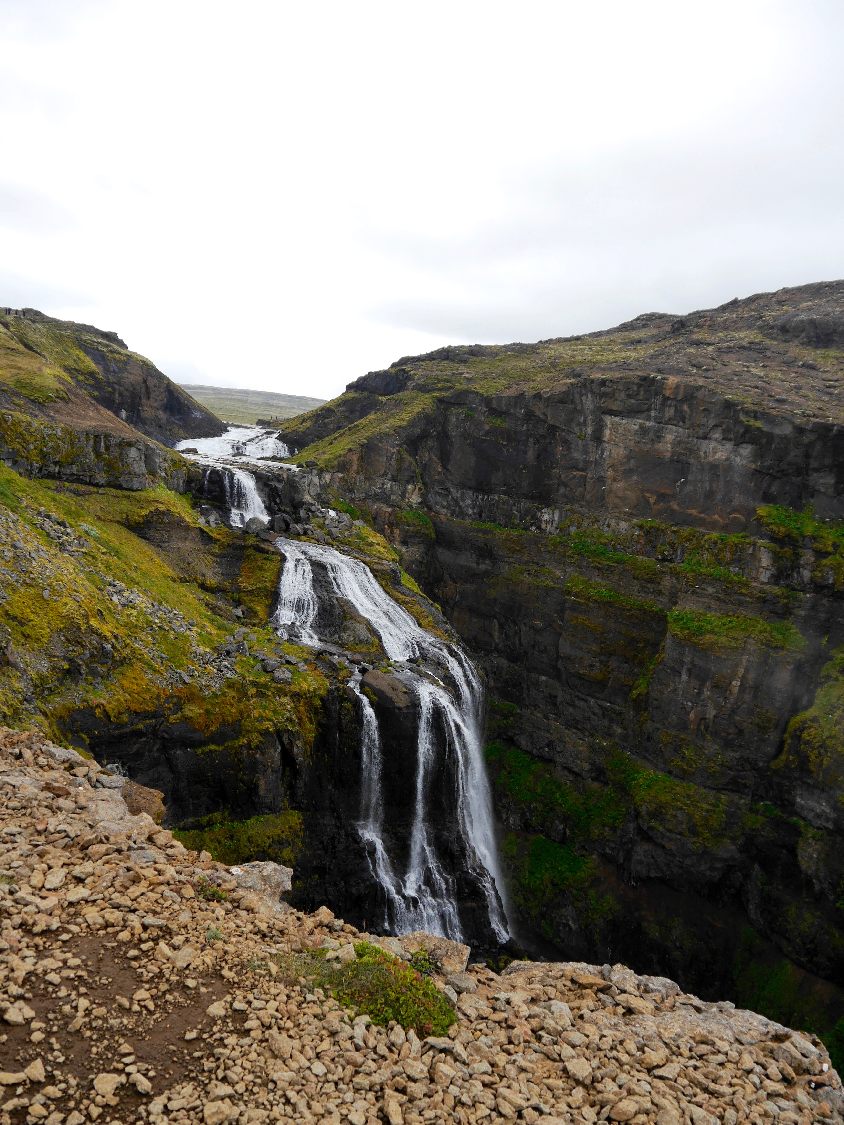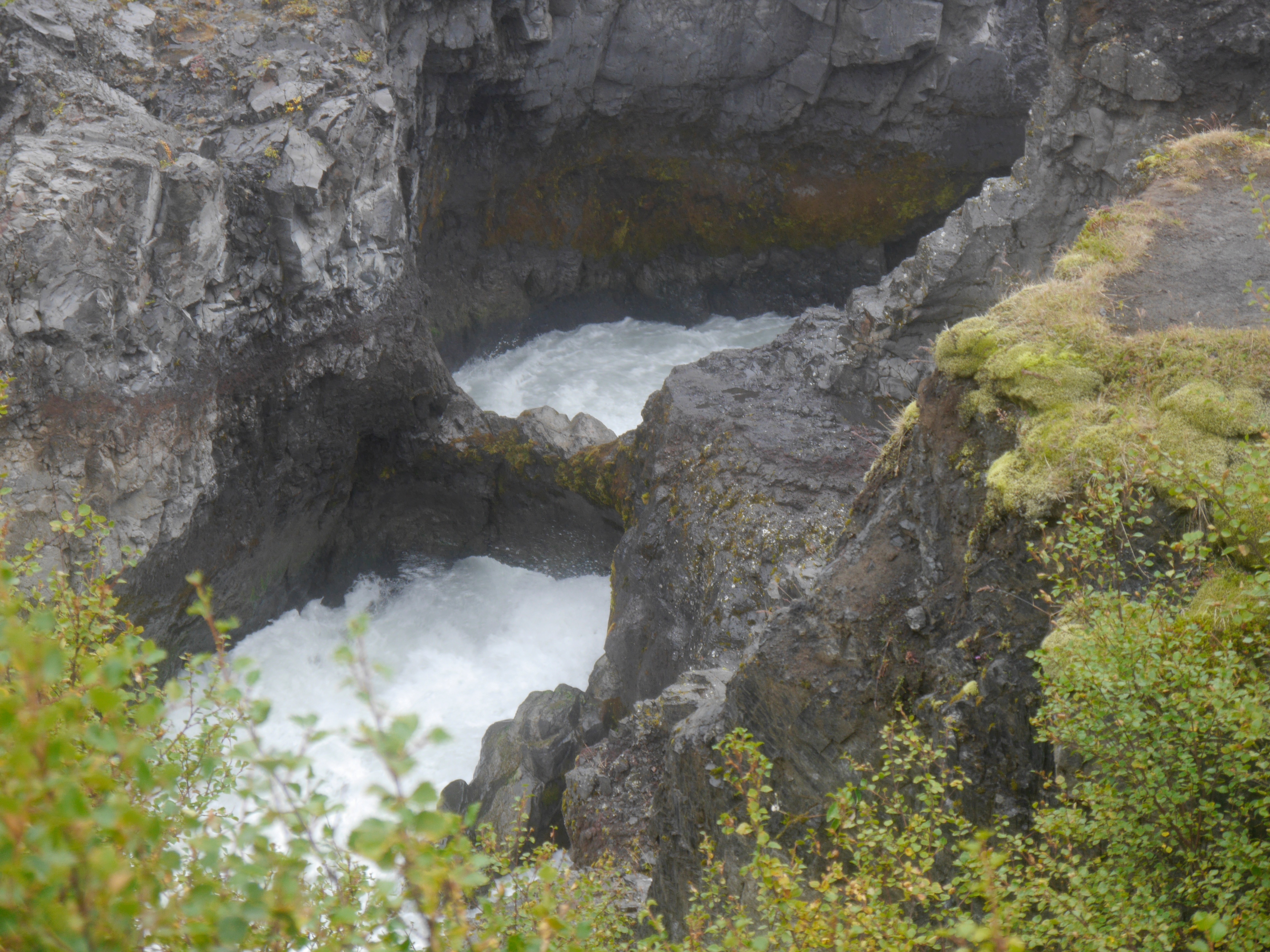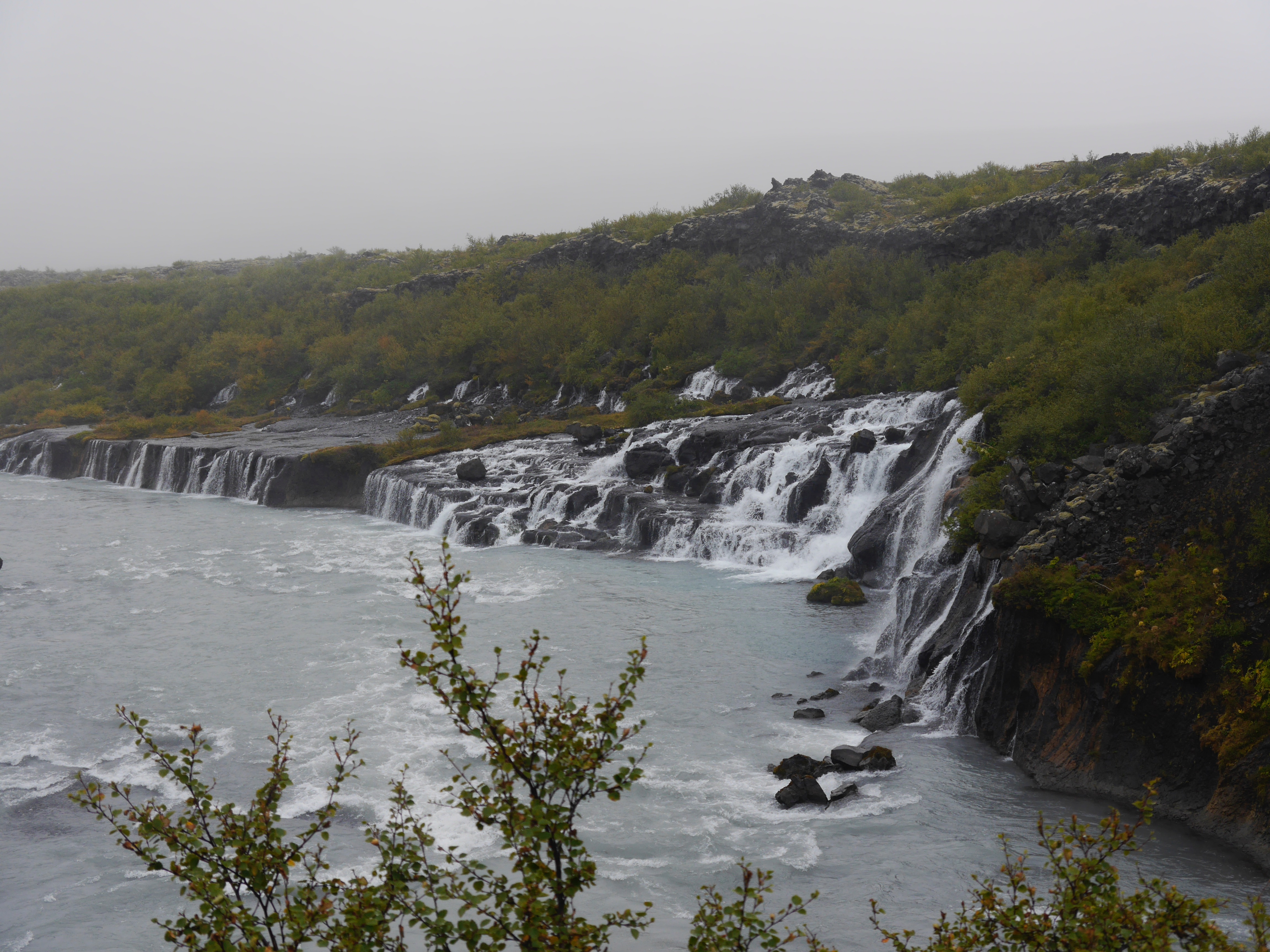 Am nächsten Tag regnet es wieder, aber wir brechen trotzdem auf. Wir wollen nach Húsafell fahren, das noch ein Stück weiter östlich liegt und auf dem Weg dahin bei den Hraunfossarwasserfällen stehen bleiben. Auf einer Länge von rund einem Kilometer quellen unzählige Wasserfälle aus einem Berg hervor und fließen in den Fluss Hvitá.