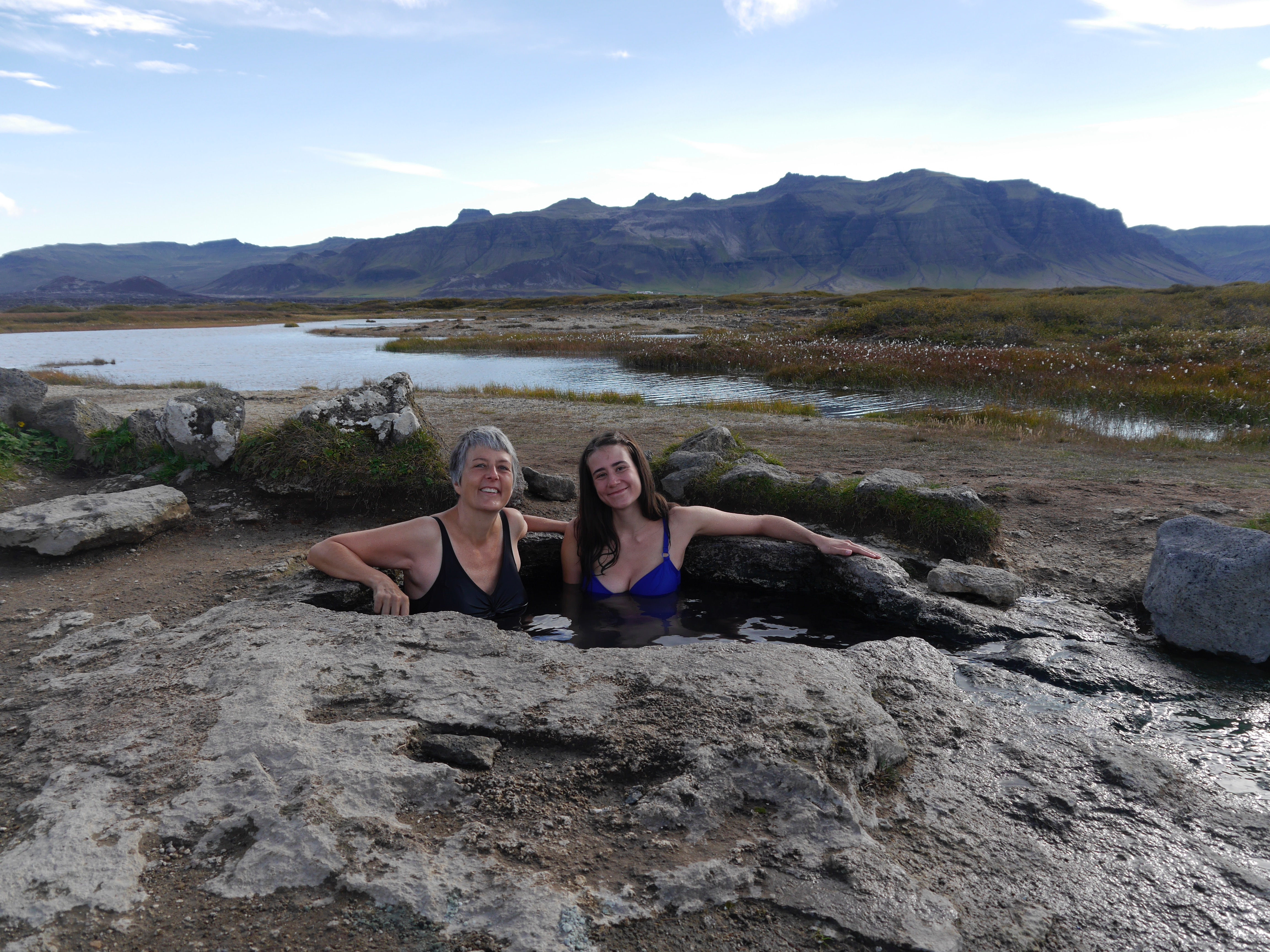 Wir verlassen unser kleines Paradies und fahren Richtung Norden durch Borgarnes und dann Richtung Westen. Unsere nächste Unterkunft liegt in Grundafjörður. Wir werden hier nur zwei Nächte verbringen. Auf dem Weg dahin gibt es einen natürlichen Hot Pot, den wir ausprobieren wollen. Als Regel bei diesen Hot Pots gilt, wenn man kommt und er wird bereits benutzt, wartet man höflich in einiger Entfernung, bis die Badenden den Hot Pot verlassen. Unser angesteuerter Hot Pot heißt übrigens Landbrotalaug, wir kriegen im Auto auf dem Weg dahin einen ziemlichen Lachanfall deswegen. Landbrotalaug ist übrigens mittlerweile geschlossen – wir aber haben noch Glück und als wir hinkommen, ist alles frei und wir können uns ausgiebig am warmen Wasser erfreuen. Wir testen erst das größere flache Becken und dann das kleine, in das wir zu zweit grade mal so reinpassen.