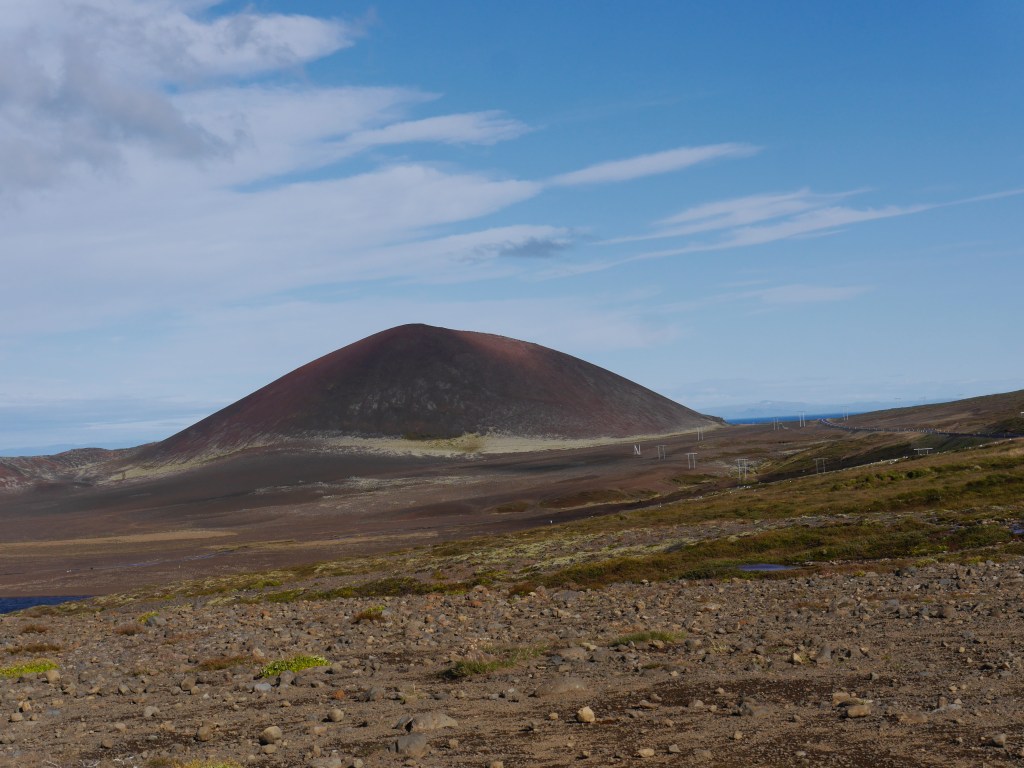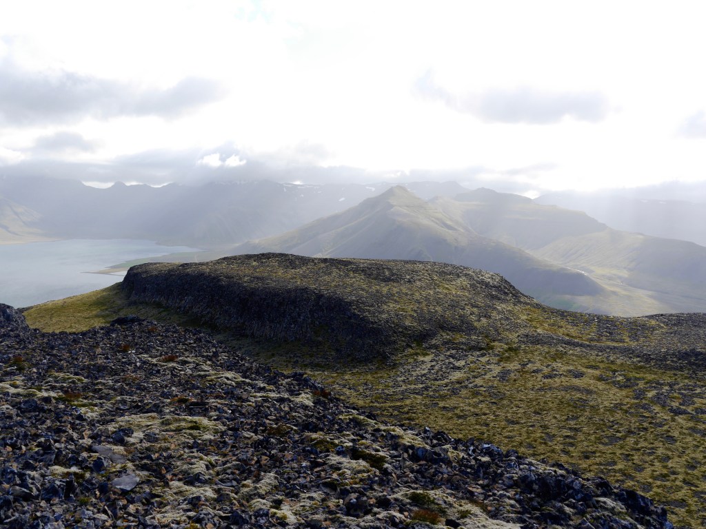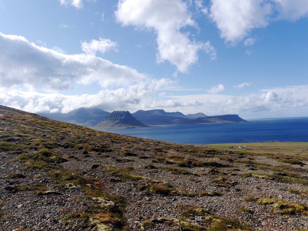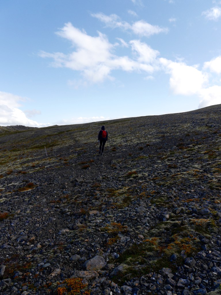 Wir wollen, bevor wir zur Unterkunft fahren, noch eine kleine Wanderung machen. Und zwar auf den Klakkur. Das Wetter ist ideal, wir haben nur wieder mal Probleme, den richtigen Ausgangspunkt zu finden. Es gibt hier auch keine Menschen, die wir fragen könnten, aber letztendlich werden wir fündig und gehen los. Wieder einmal sind wir ganz alleine unterwegs. Auf und Abstieg sollten in etwa 3 Stunden zu schaffen sein. Der Weg ist sehr gut markiert und geht anfangs hauptsächlich über Geröll und Weiden. Der Einstieg auf das Plateau ist sehr steil, aber es gibt Halteseile und dauert nicht sehr lang.