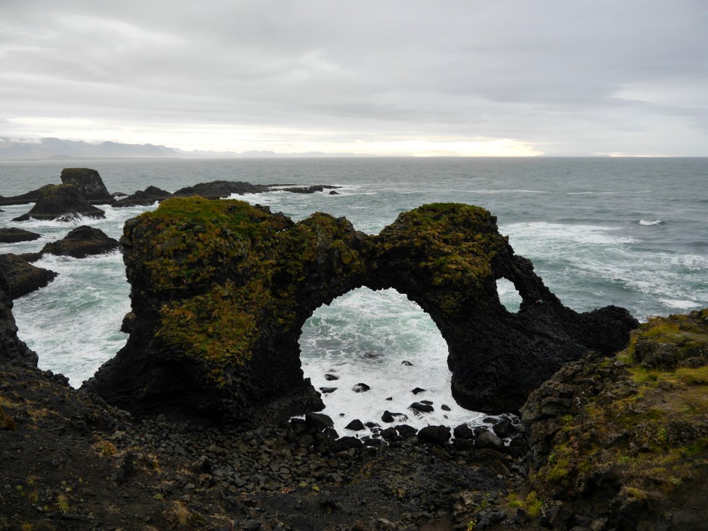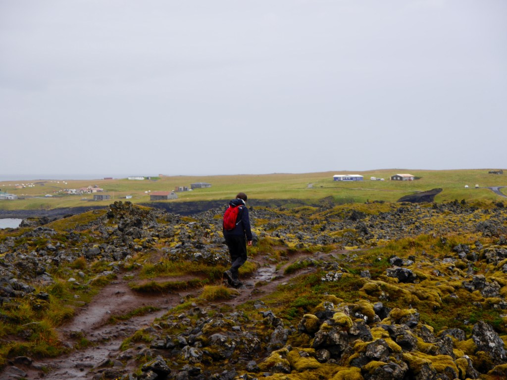 Am nächsten Tag holen wir aus der Apotheke eine Salbe und ich hoffe einfach, dass es damit in Ordnung kommt. Ich weiß nicht mal, ob es in so kleinen Orten einen Arzt, eine Ambulanz oder gar Krankenhaus gibt. Nicht nur mein Bein ist schlecht, auch das Wetter ist schlecht – sehr schlecht. Aber wir fahren trotzdem zu unserer geplanten Wanderung nach Arnarstapi, einem kleinen Fischerort südlich von uns an der Küste. Es gibt hier einen kurzen, aber feinen Klippenwanderweg nach Hellnar.