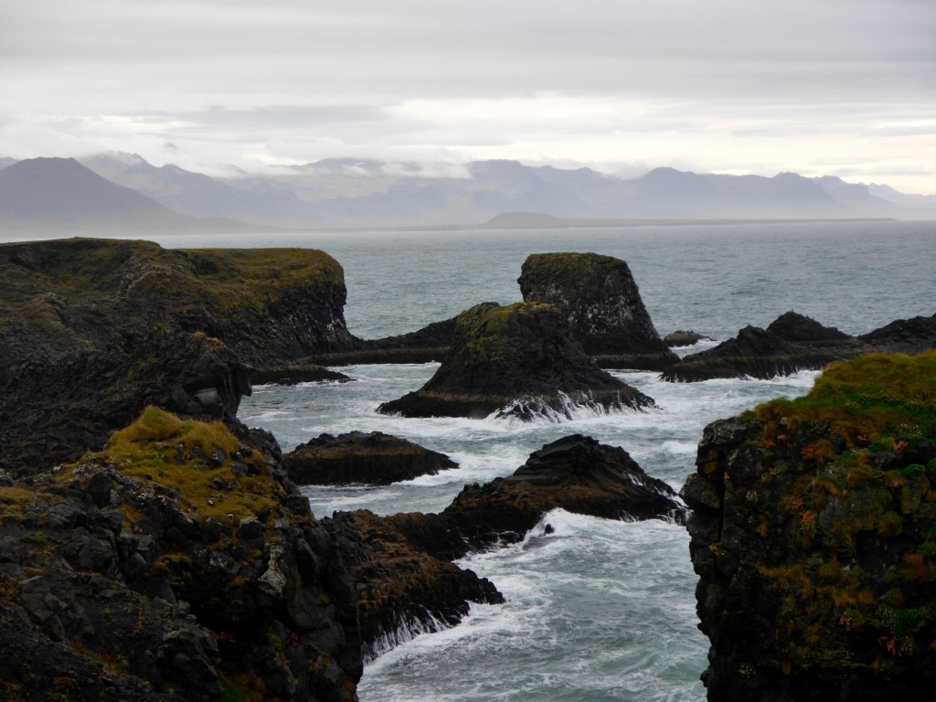 Es hat schon während der Wanderung sehr stark zu regnen begonnen und es wird jetzt auch nebelig. Eigentlich wollten wir die Straße hinauf zum Snæfellsjökull fahren, aber bei den Witterungsverhältnissen bringt das gar nichts. Wir suchen eine andere Wanderung an der Küste, aber als wir dort ankommen, regnet es in Strömen und so fahren wir einfach weiter, immer der Küste entlang. Wir treffen auf ein großes Informationszentrum für den Nationalpark und schauen uns dort ein wenig um. Da das Wetter immer schlechter wird, fahren wir einfach weiter, bis wir wieder in Grundafjörður sind.