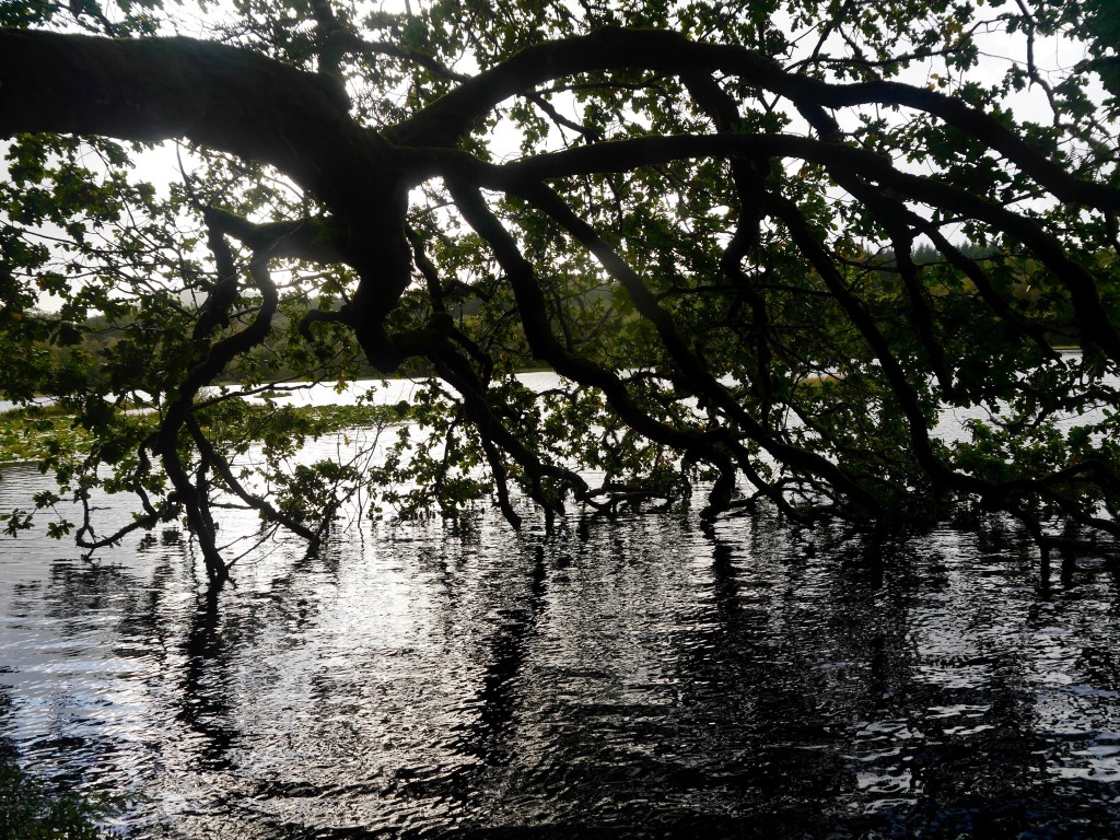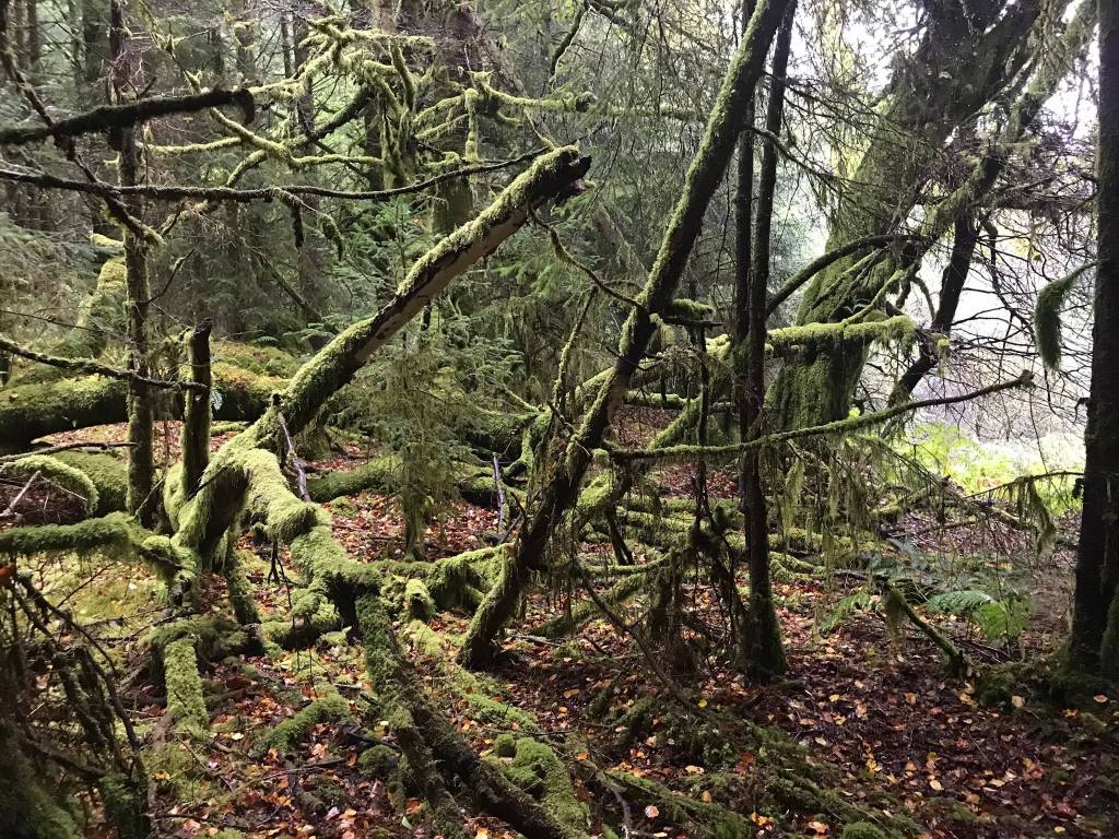 Als es nicht mehr ganz so stark regnet, bleiben wir stehen und folgen einem angeschriebenen Wanderweg (Tall Trees) in den Wald. Wunderschön! Leider geht aber auch ein richtiger Sturm und die tall trees machen beängstigende Geräusche, so verlassen wir den Wald wieder und fahren weiter. Als wir auf der Ostseite des Loch Awe wieder Richtung Norden fahren, wird die Straße noch schmaler und teilweise liegen kleinere Äste auf der Straße. Wir sind froh, dass wir nichts aufs Dach kriegen 🙂 .