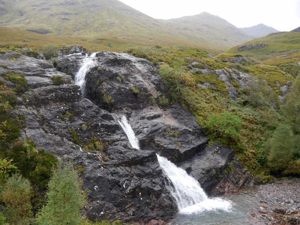 Unterwegs nehmen wir auch einen Autostopper mit. Erst kommunizieren wir auf Englisch, bevor wir draufkommen, dass er Deutscher ist, dann plaudern wir weiter auf Deutsch. Ich bin so beeindruckt von diesen Bergen, dass ich vergesse, den Viewpoint für Meeting of three waters (wieder Wasserfälle) anzusagen. Macht nichts, wir bringen unseren Mitfahrer schnell zum Glencoe Visitor Centre und fahren noch mal zurück zu den Wasserfällen. Es sind nur wenige Kilometer.