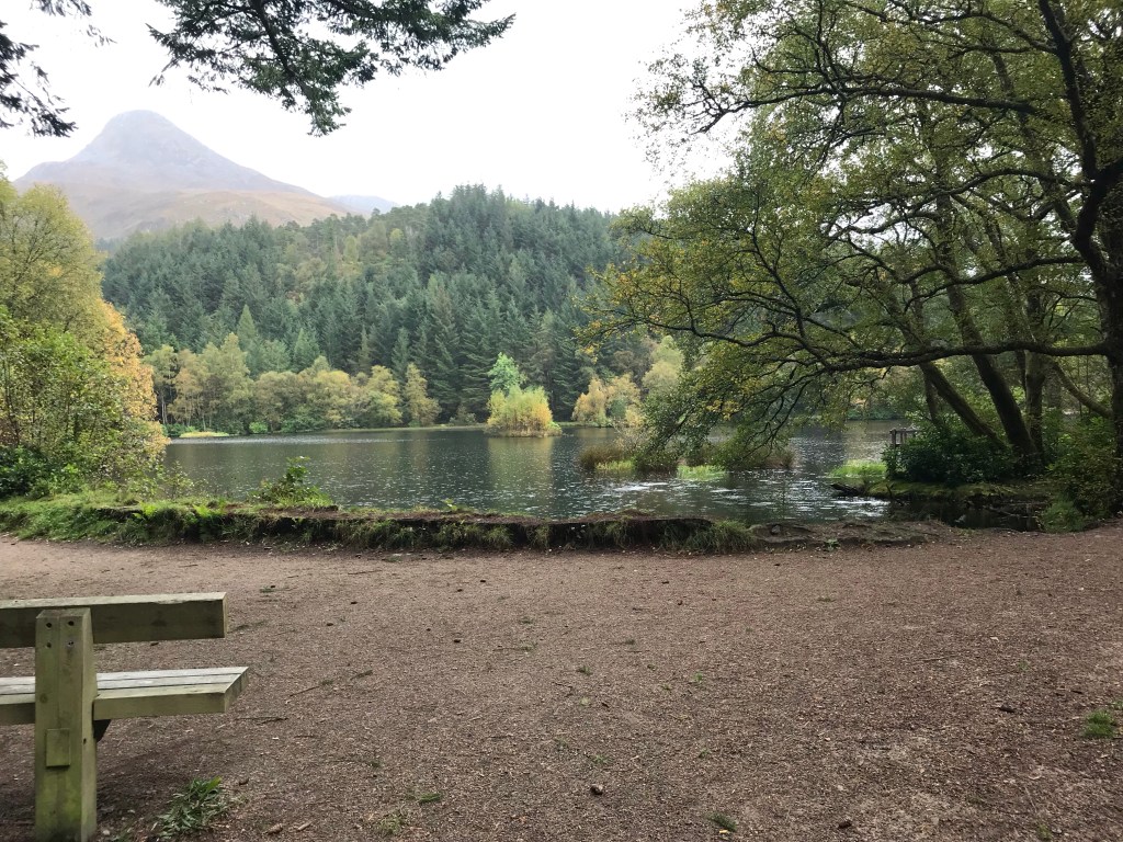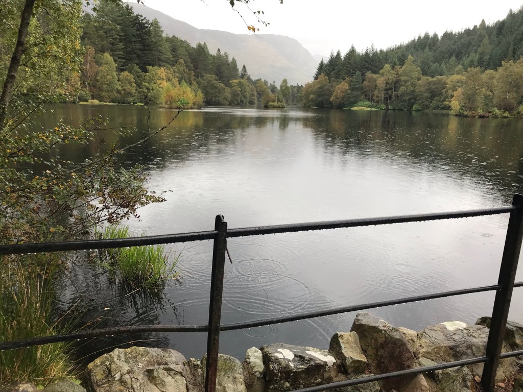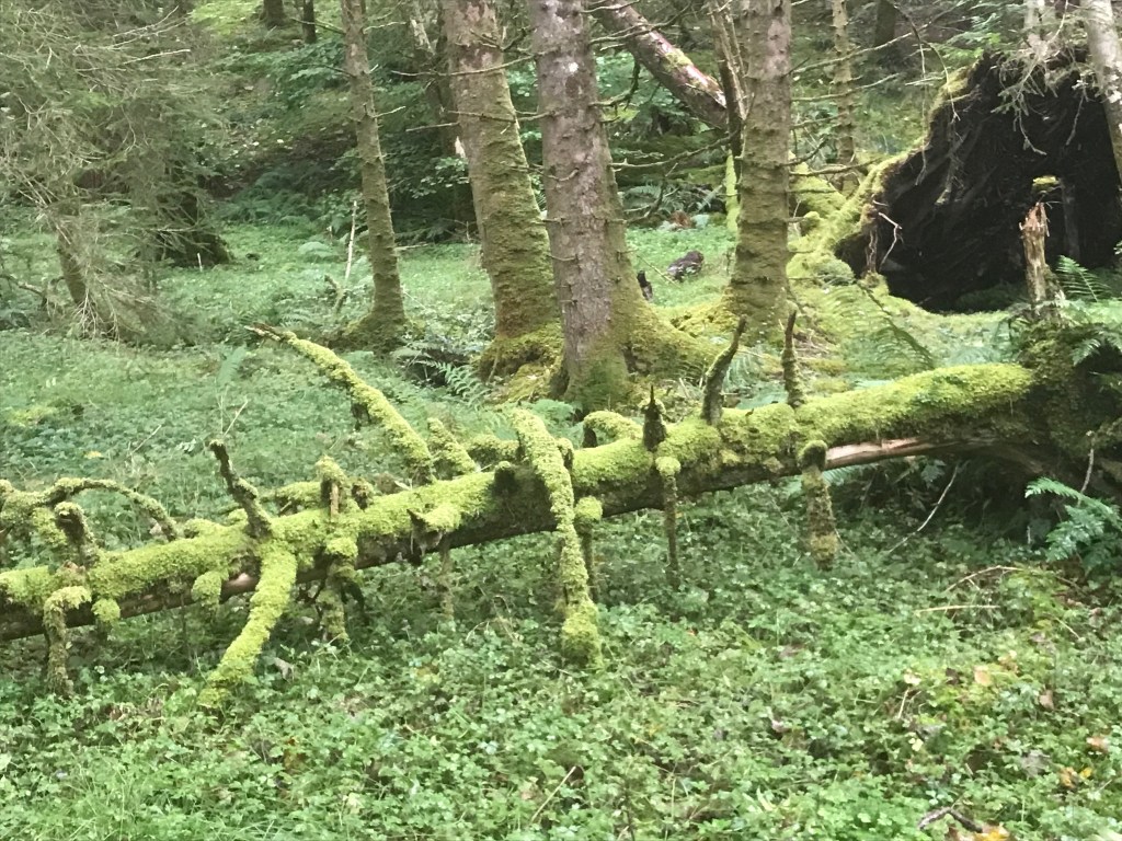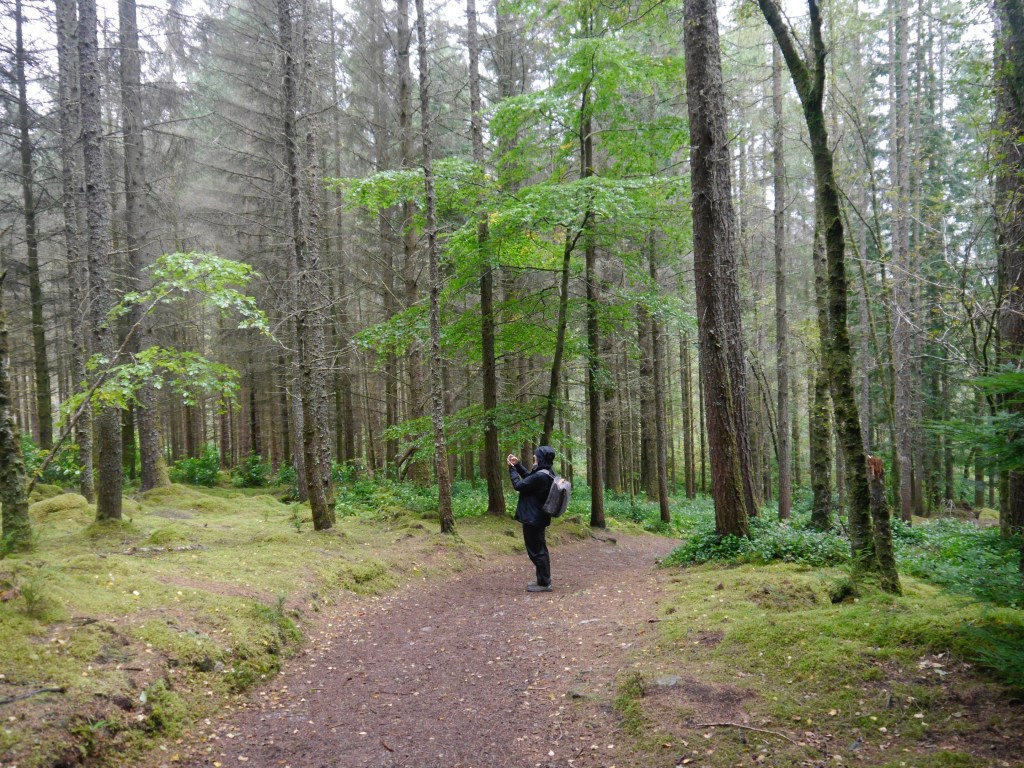 Herumfahren und fotografieren kann ziemlich anstrengend sein, also gönnen wir uns in Glencoe ein Päuschen im Crafts & Things mit Tearoom. Wir hatten eigentlich gehofft, hier handbemaltes Geschirr oder kleinere Kunstwerke oder Ähnliches zu entdecken, werden aber von touristischem Klimbim enttäuscht. Mittlerweile regnet es ziemlich und wir hätten beide Lust, uns einfach im Bett zu verkriechen und den restlichen Tag zu lesen. Aber das wäre ja langweilig, also stärken wir uns kurz im Tearoom und fahren zum Lochan Naturpark in Glencoe, wo es mehrere walking trails gibt. Doris ist immer so begeistert von den stark bemoosten Wäldern und wagt sich tief in den Wald hinein, um Fotos zu machen.