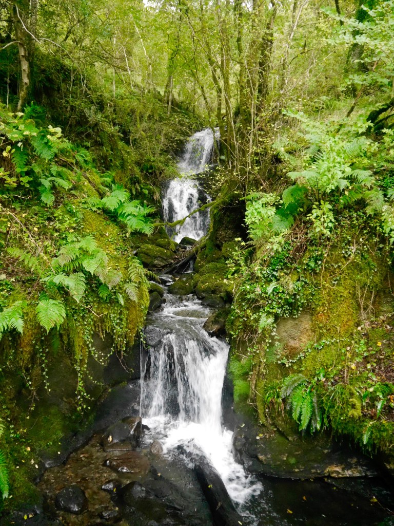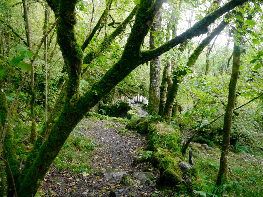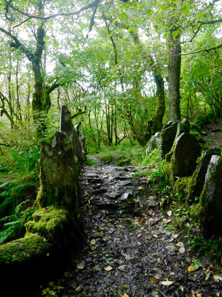 Wir machen uns zu Fuß auf die Straße zurück, vielleicht haben wir ja eine Abzweigung in den Wald verpasst. Und tatsächlich 5 Minuten später finden wir einen Weg in den Wald. Der in einer Sackgasse endet? Ach nein, da geht doch links ein schmaler Pfad steil bergauf, na schauen wir mal, wo der hinführt. Es geht eine Weile bergauf und dann nach rechts, für die Fairy Bridge müssten wir uns aber links halten. Na gehen wir mal bis zur nächsten Kurve und schauen, ob es dann nach links geht und tatsächlich macht der Weg eine scharfe Linkskurve. Auf beiden Seiten ist der Weg dicht von wilden Brombeersträuchern umwachsen, es regnet pausenlos, der Boden ist matschig. Alle paar Minuten halten wir inne, um uns an Google Maps zu orientieren. Wir überqueren Stock und Stein und hin uns wieder ein kleines Bächlein. Wir überlegen, ob wir umkehren sollen, als Doris meint, in der Ferne Steine erkennen zu können. Vielleicht die Brücke?