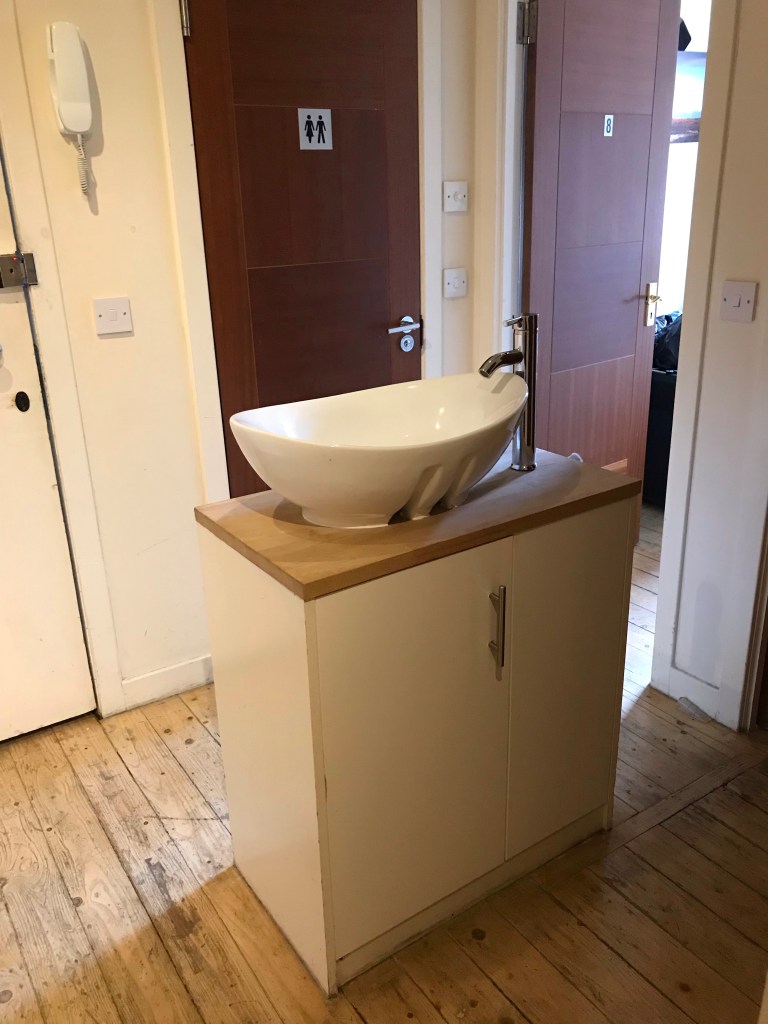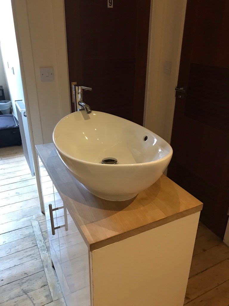 Wir fahren bis zur Haymarket Station und machen uns dann zu Fuß auf die Suche nach unserem Apartment, das nur ein paar Minuten entfernt liegt. Wir haben zwar ein eigenes Zimmer in der Wohnung, teilen aber WC, Bad und Küche mit zwei weiteren Zimmern. Als wir ankommen, ist niemand da, wir müssen aber gleich mal herzlich lachen über die Konstruktion, die ich Waschbeckeninsel im Vorzimmer nenne. Wir haben so etwas noch nie zuvor gesehen und Doris war ja schon in sehr vielen Airbnbs. Wir bekommen einen hysterischen Lachanfall bei der Vorstellung, dass wir hier abends in trauter Eintracht mit den anderen vor der Überwachungskamera unsre Zähne putzen.
