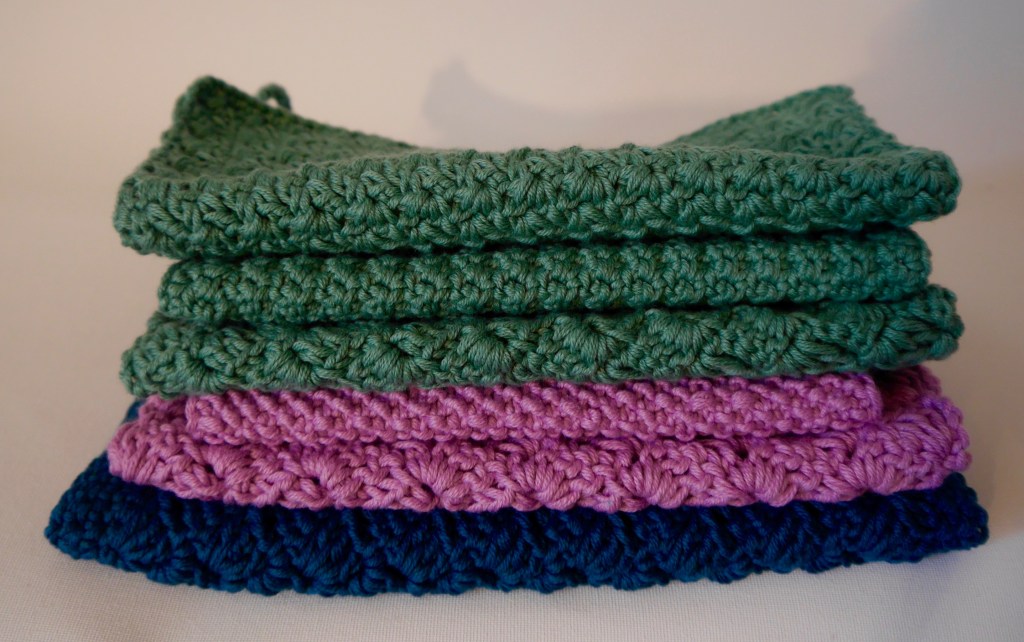 Meistens mache ich ja mehrere Dinge nebeneinander, um Abwechslung zu haben. So sind abends (in OÖ am Kaminfeuer) oder mit Hörbuch im Ohr Spültücher entstanden. Ich selbst verwende nur noch meine aus Baumwollgarn selbst gemachten Spültücher. Sie eignen sich aber auch wunderbar als Geschenke oder Mitbringsel. Achja, ein feines Seifchen habe ich auch wieder geseift. Eine (fast) reine Kokosölseife, nur mit etwas Kakaobutter verfeinert. Sie war ruck zuck fertig und riecht wunderbar.