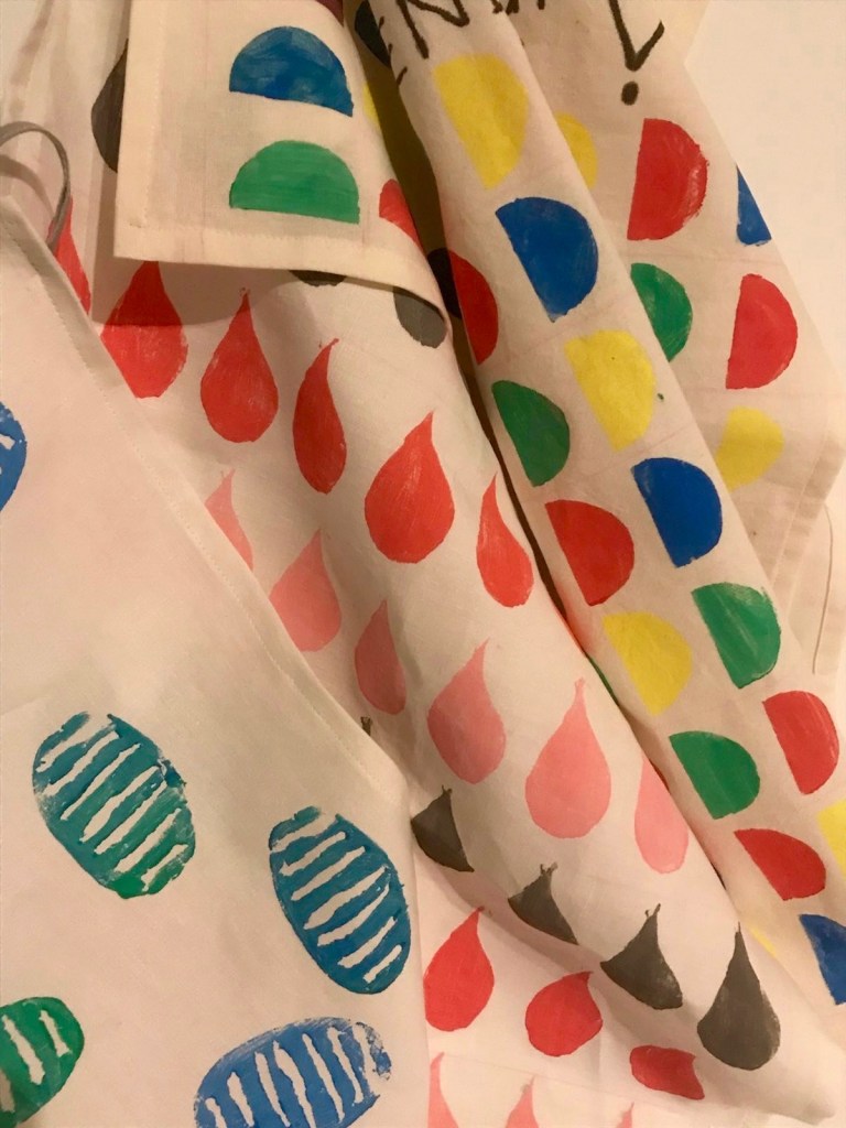 So habe ich in den letzten Wochen aus einem alten Leinenstoff Geschirrtücher genäht und mit Stoffmalfarben bedruckt. Ich habe dazu die herkömmliche Kartoffeldrucktechnik verwendet.