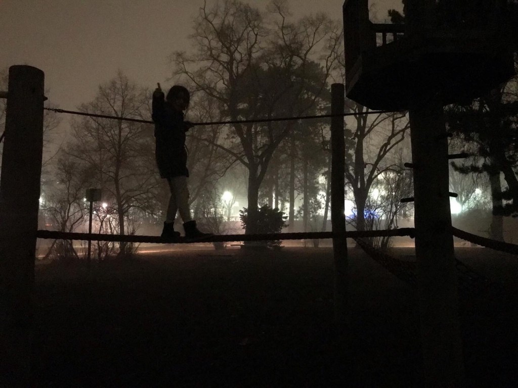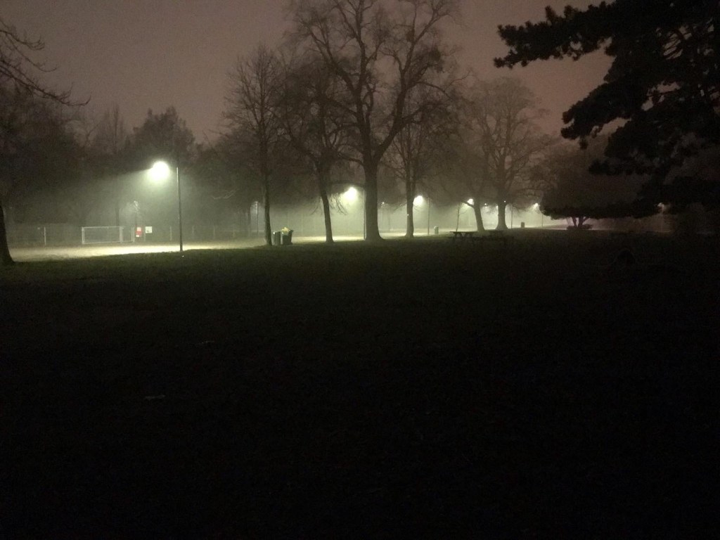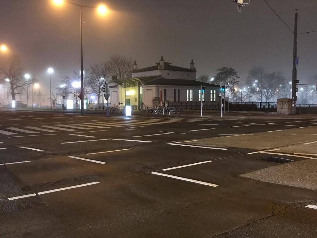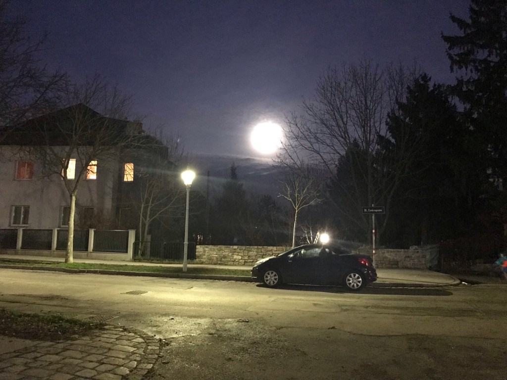 Einen Nachmittag haben wir faul zu Hause verbracht, also beschließen wir abends einen Spaziergang durch unser Grätzl zu machen, um überschüssige Energie zu verbrauchen. Nachts im Nebel ist es schön und die Kinder finden es aufregend.