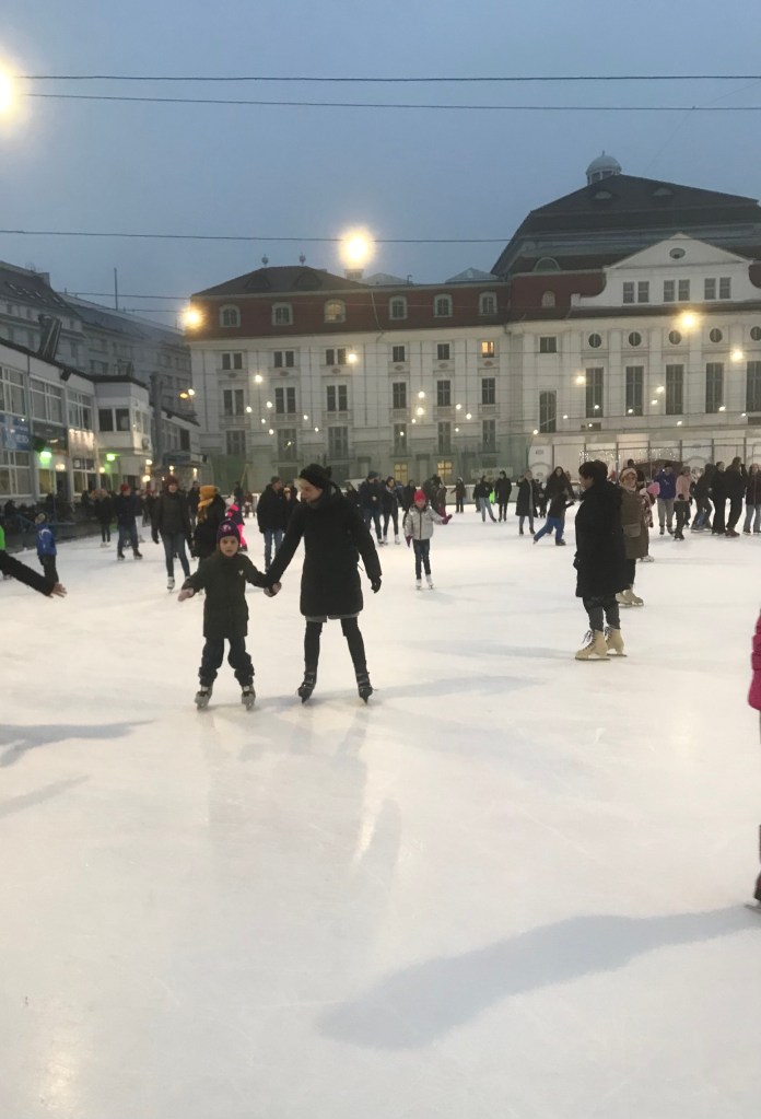 In Wien kann man an vielen Plätzen wunderbar Eislaufen. Also machen wir uns an einem Nachmittag auf und fahren zum Wiener Eislaufverein. Leider ist der Wiener Eistraum am Rathausplatz noch nicht geöffnet – da wäre es noch schöner, aber hier ist es auch wunderbar. Wir drehen mehr oder weniger graziös unsere Runden und haben Spaß. Leider lösen sich meine Schuhe – die wirklich schon sehr alt sind – auf dem Eis auf. Nachdem wir alle „Bröseln“ aufgesammelt haben, muss ich barfuß vom Eis rutschen. Zum Glück kann man gute Schuhe ausleihen, und so können wir noch viele weitere Runden drehen.