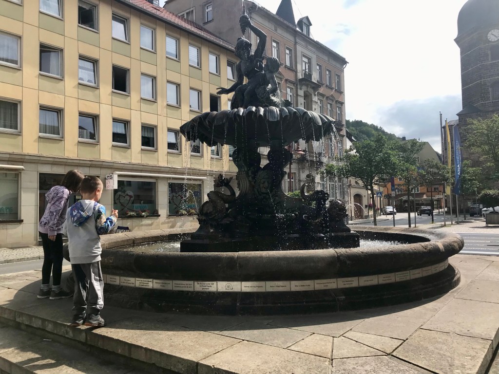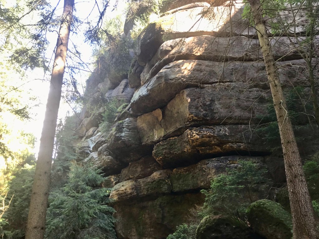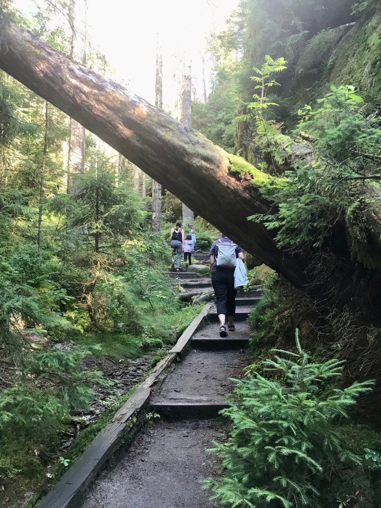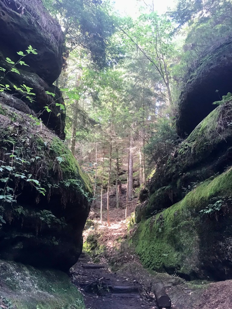 Am nächsten Tag überlegen wir uns, was wir Nettes mit den Kindern machen können. Unsere neuen Freunde von Hrušov haben uns die Kirnitzschtalbahn und den Spaziergang zum „Kuhstall“ empfohlen. Mit unserer Gästekarte können wir alle Busse und auch die Kirnitzschtalbahn benützen. Ein kurzer Blick auf google Maps sagt uns, dass wir aber auch zu Fuß hinunter nach Bad Schandau gehen können. Nur 20 Minuten durch den Wald. Gesagt, getan und erst mal schlendern wir durch die Stadt. Dann fahren wir mit der Kirnitzschtalbahn bis zur Endstation und gehen zum bekannten „Kuhstall“, einem Felsentor. Schon wieder durch den Wald, und das auch immer bergauf, was diesmal beide Kinder nicht besonders freut. Der Weg ist nicht so einsam wie der gestrige, es sind sehr viele Familien unterwegs. Aber schon nach einer halben Stunde sind wir am Ziel und genießen die Aussicht und die einzigartige Atmosphäre. Wir sind wirklich sehr beeindruckt von der sehr speziellen Schönheit der Natur hier. Auf dem Rückweg kneippen wir noch ein wenig im eiskalten Bächlein, bevor es wieder mit der schnuckeligen Bahn zurück nach Bad Schandau geht. Für die Kinder gibts noch einen Lolli aus der berühmten Bonbon Manufaktur, und dann treten wir auch schon den Rückweg an, wieder bergauf durch den Wald bis Ostrau.