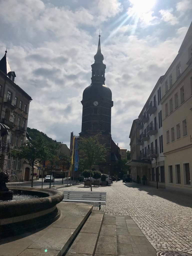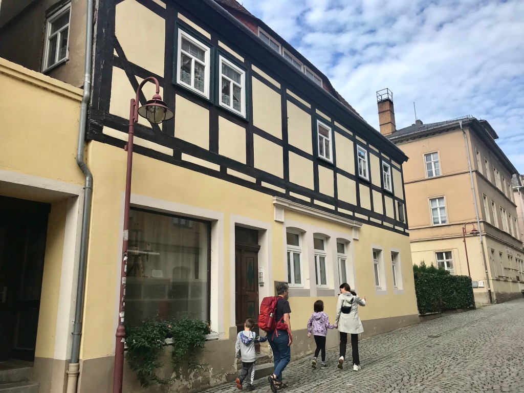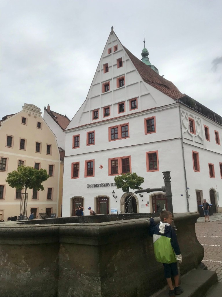 Der nächste Tag ist auch schon wieder Abreisetag, wir wollen aber noch auf die Burg Königstein und nach Pirna, bevor sich unsere Wege wieder trennen. Die Burg schauen wir uns dann nur von unten an, wir sind nicht mehr sonderlich motiviert und auch die Kinder jammern und maulen und wollen den Weg von der Parkgarage zur Burg hoch nicht gehen. Also fahren wir gleich nach Pirna. Die Stadt gefällt uns sehr gut. Die Altstadt mit den kleinen Gässchen und Fußgängerzonen und alten Gebäuden ist wirklich schön.