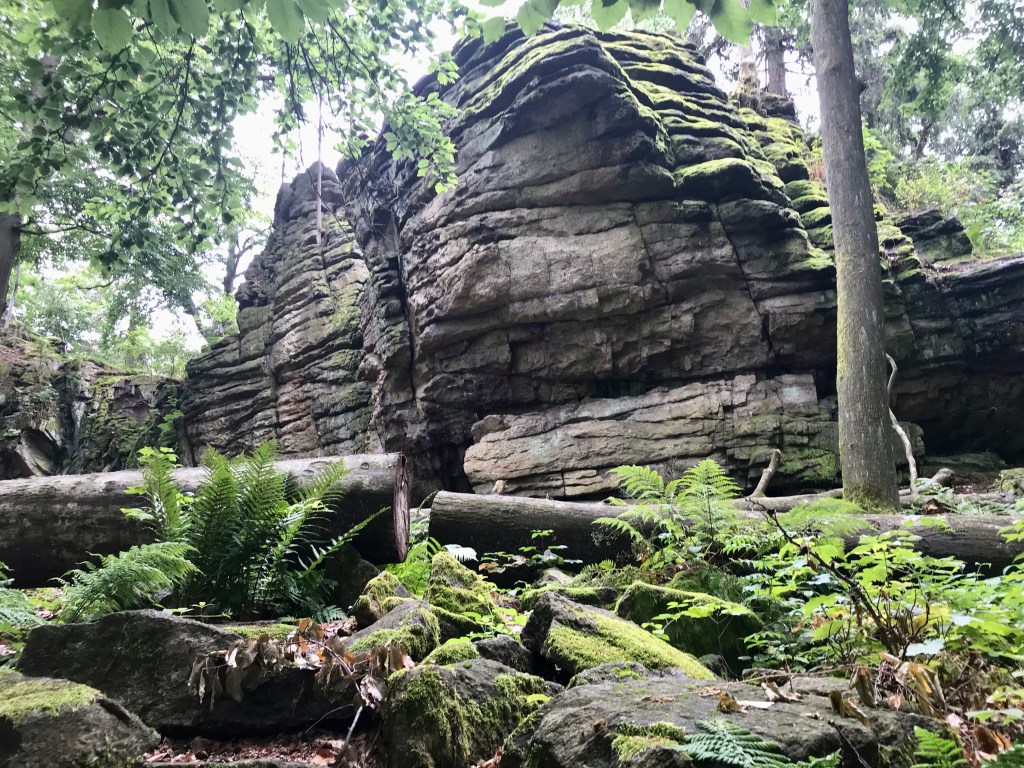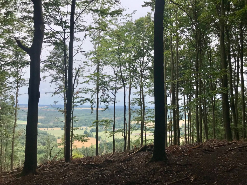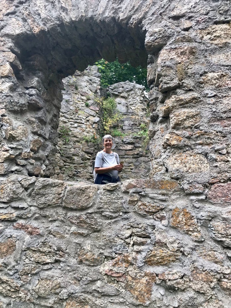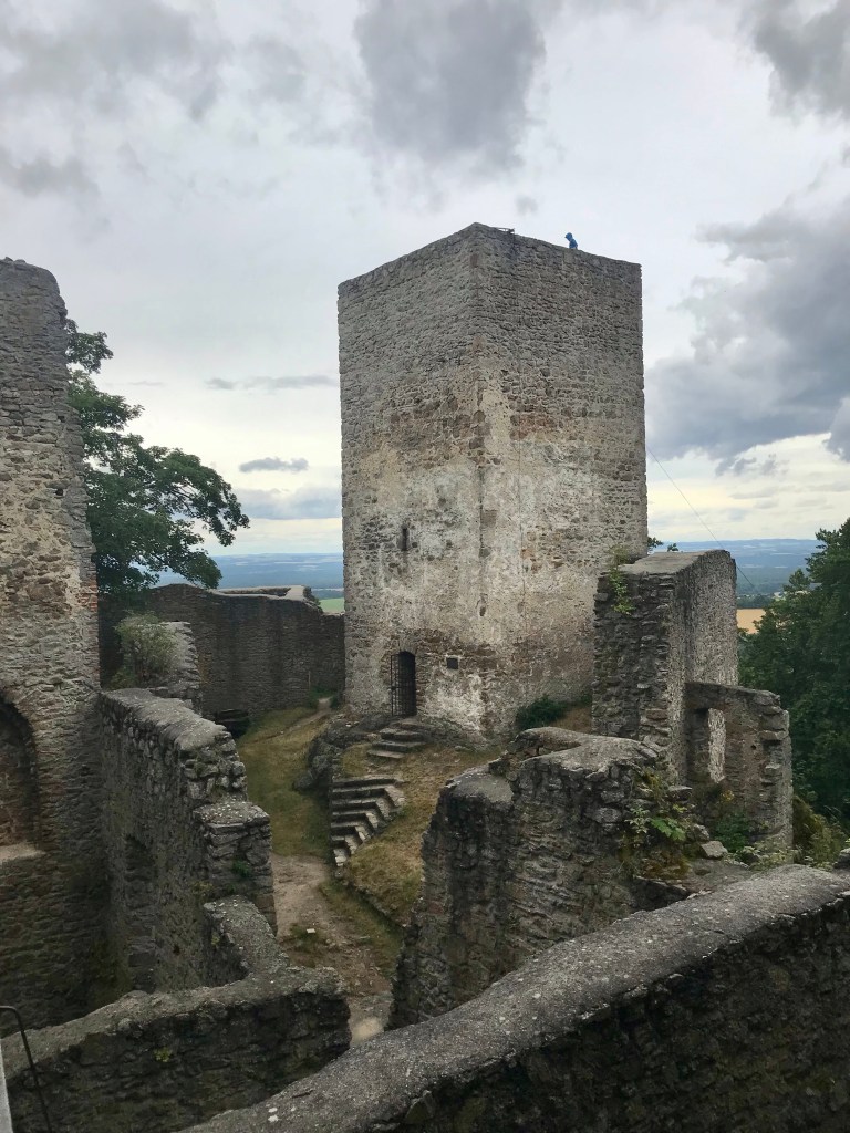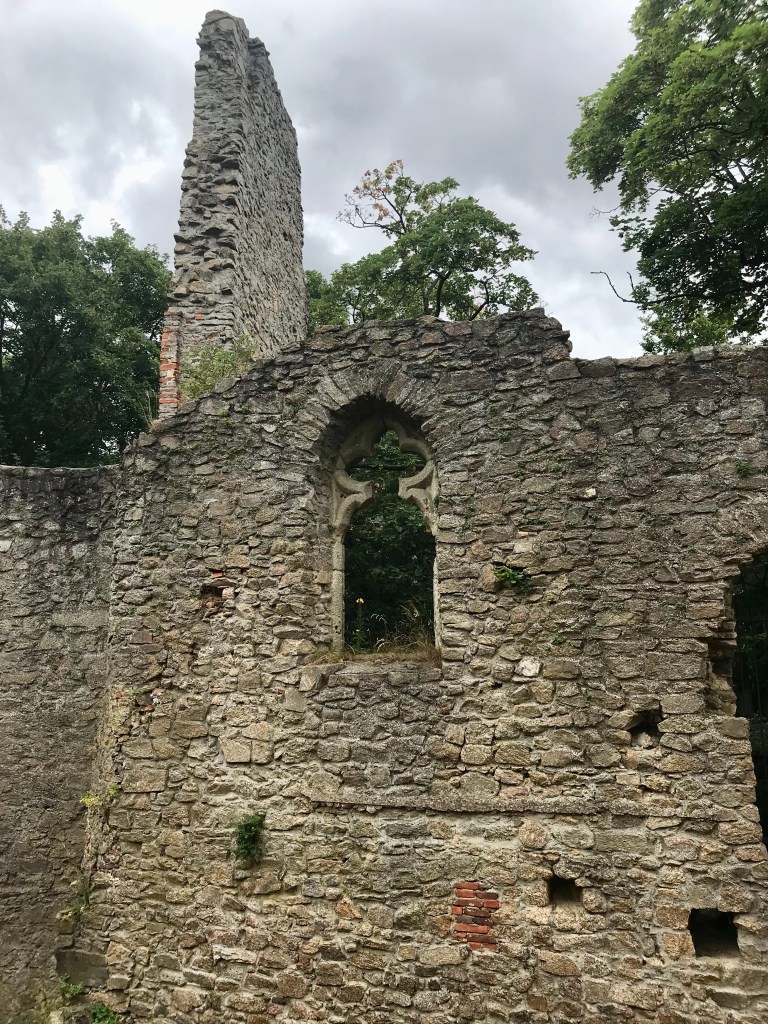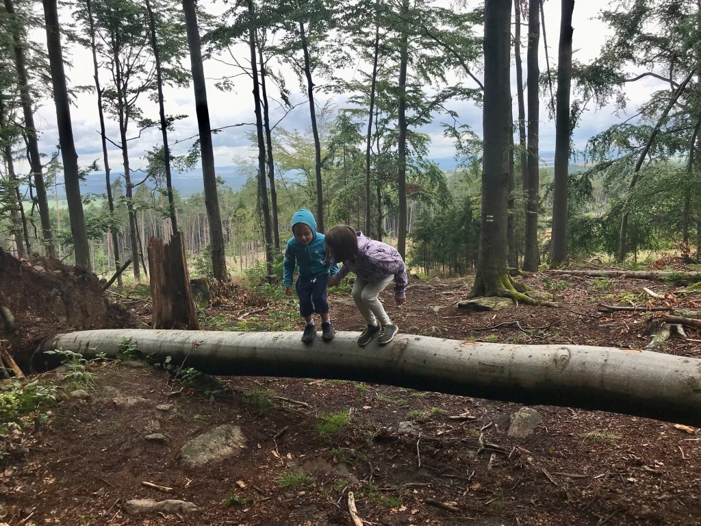 Am nächsten Tag regnet es leider schon wieder. Wir sind schon etwas frustriert von diesem kühlen, regnerischem Sommerwetter. Ich würde jetzt gern meine kurzen Hosen und Tank-Tops gegen Wollsocken eintauschen. Trotz des Schlechtwetters müssen wir jetzt mal raus, sonst fällt uns noch die Decke auf den Kopf. Doris geht es zum Glück besser und wir beschließen, die Reise wie geplant zu beenden. Wir fahren zu einem großen Spielplatz, den ich auf der Herfahrt entdeckt hatte. Die Kinder rennen vergnügt herum, während wir Erwachsene Kreise um den Spielplatz ziehen. Am Nachmittag lässt der Regen etwas nach, aber das Wetter wirkt doch recht unstabil. Wir beschließen zur 8 km entfernten Burgruine in Choustník zu fahren. Dort angekommen fällt uns ein, dass wir vollkommen vergessen haben, uns Tschechische Kronen zu besorgen. Na hoffentlich können wir den Eintritt in die Burg in Euros oder mit Karte bezahlen. Zur Ruine führt uns ein kurzer Weg (etwa 500m) bergauf durch den Wald. Doris und ich sind besonders angetan von diesem von Moos überwachsenen Wäldchen und müssen unbedingt alles fotografieren. Die Kinder balancieren auf einem gefällten Baum und machen Sprungfotos. Von der Burg (Ja! Wir konnten mit Euros bezahlen!), sind wir alle sehr angetan. Die Fotos sprechen für sich selbst.