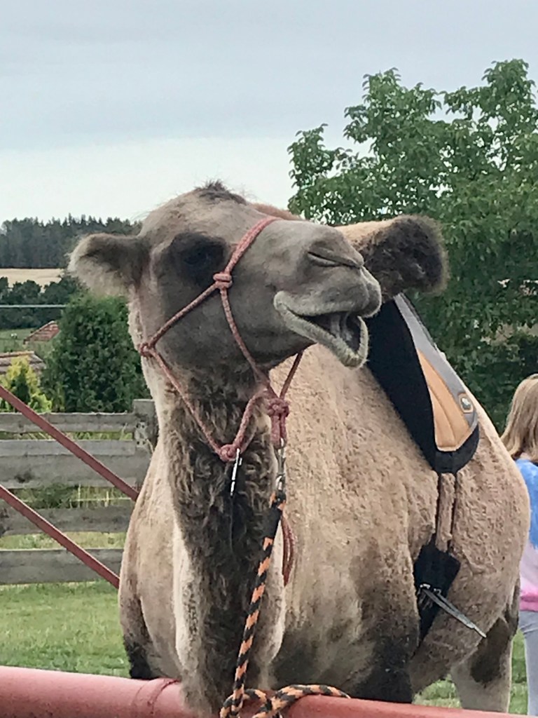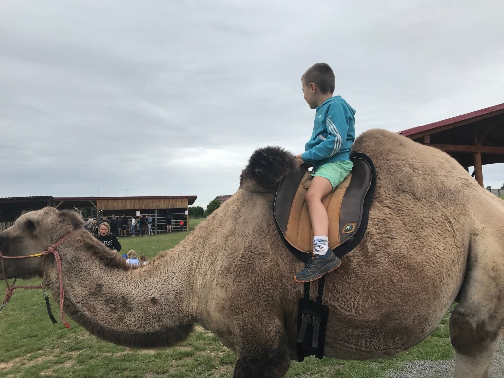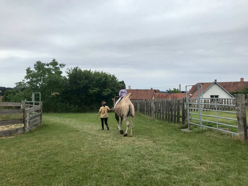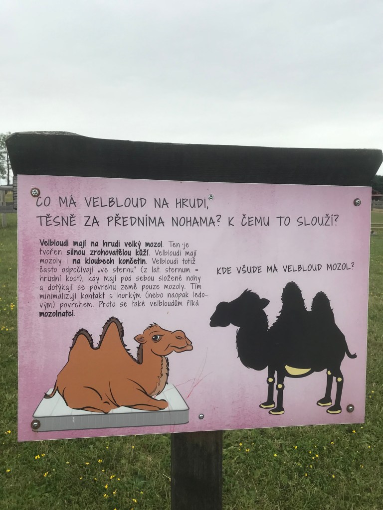Unsere Vermieterin hat uns beim Wegfahren noch eine Kamelfarm empfohlen. Da es noch früher Nachmittag ist und wir nicht schon wieder in die Unterkunft wollen, fahren wir dahin. Sollte es nicht regnen, werden wir uns die Farm ansehen. Das Glück ist uns hold, es gibt grade eine Regenpause, als wir ankommen. Es sind schon sehr viele Familien da und wir sind die einzigen nicht tschechischen Touristen. Neben Kamelen gibt es auch noch Lamas und Pferde. Ein Lehrpfad über Kamele informiert uns in Tschechisch über Besonderheiten der Kamele. Dank Google Translate lernen wir z.B., dass Kamele keine Schneidezähne haben. Sehr interessant. Die Kinder dürfen je eine Runde auf den großen Tieren reiten, dann vertreibt uns auch schon wieder der Regen.