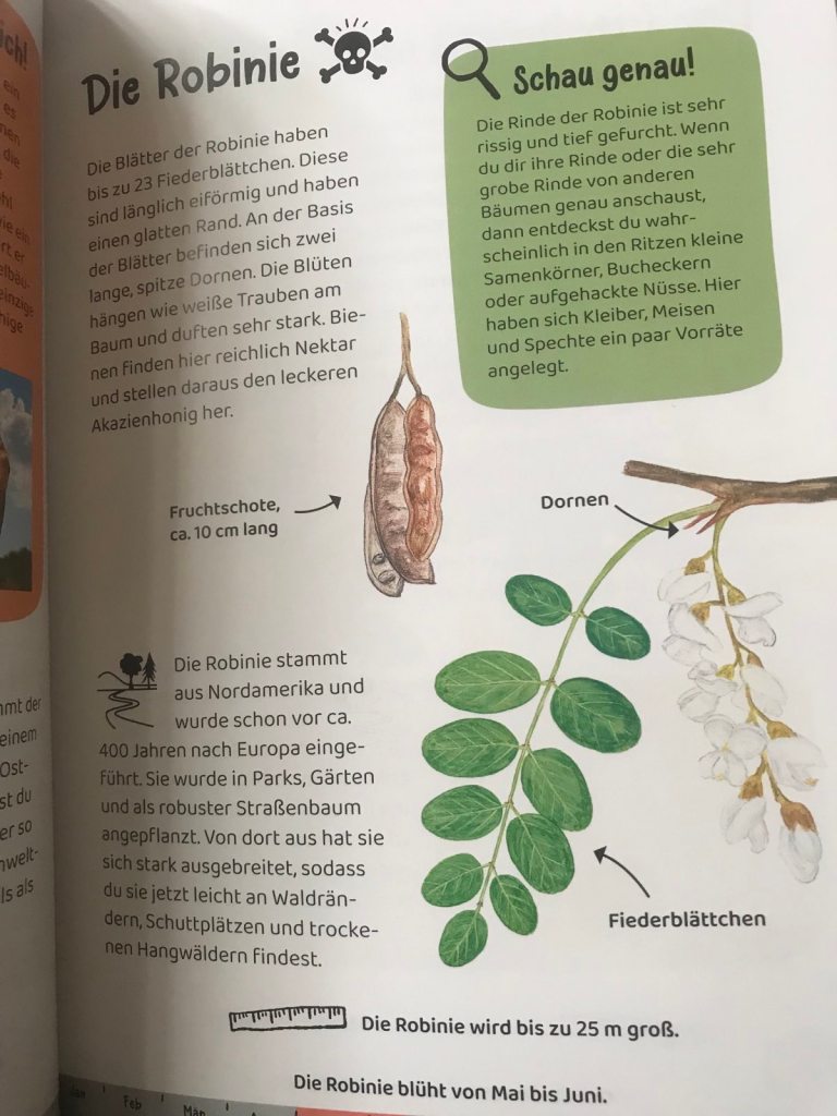 Hier kommt ein Nachtrag zu den Akazienbäumen. Die Kräuterfreundin hat uns gesagt, das sei „Bagrem“. Die deutsche Übersetzung lautet „Akazie“. Nun bin ich aber beim Durchblättern des „Tier- und Pflanzen – Führers“ von den Kindern auf folgende Seite gestoßen: