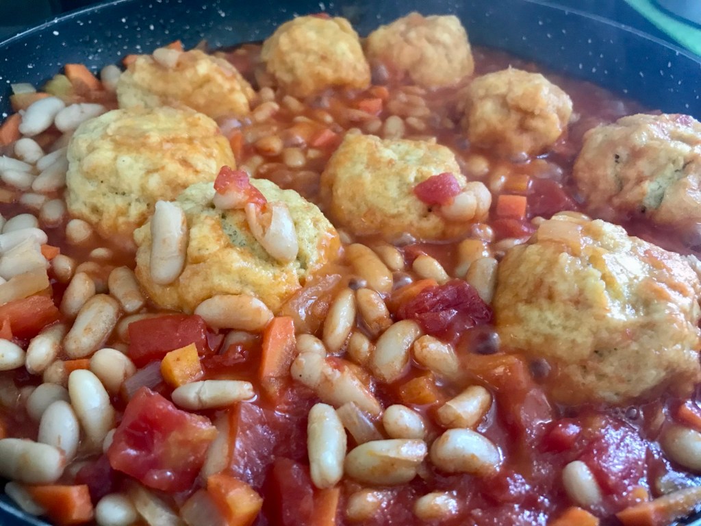Anfangs hatte ich Angst, dass die Knödel zerfallen oder sich im Eintopf auflösen (der Teig war recht feucht). Aber das taten sie nicht, sondern sie gingen wider Erwarten schön auf. Vom Eintopf war dann nicht mehr viel Flüssigkeit übrig, da die Knödel fast alles aufgesogen haben, wer also mehr Flüssigkeit möchte, sollte noch mehr Wasser oder Passata hinzufügen.