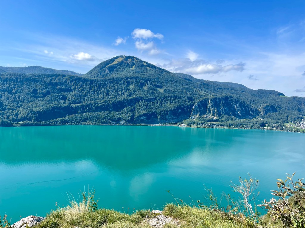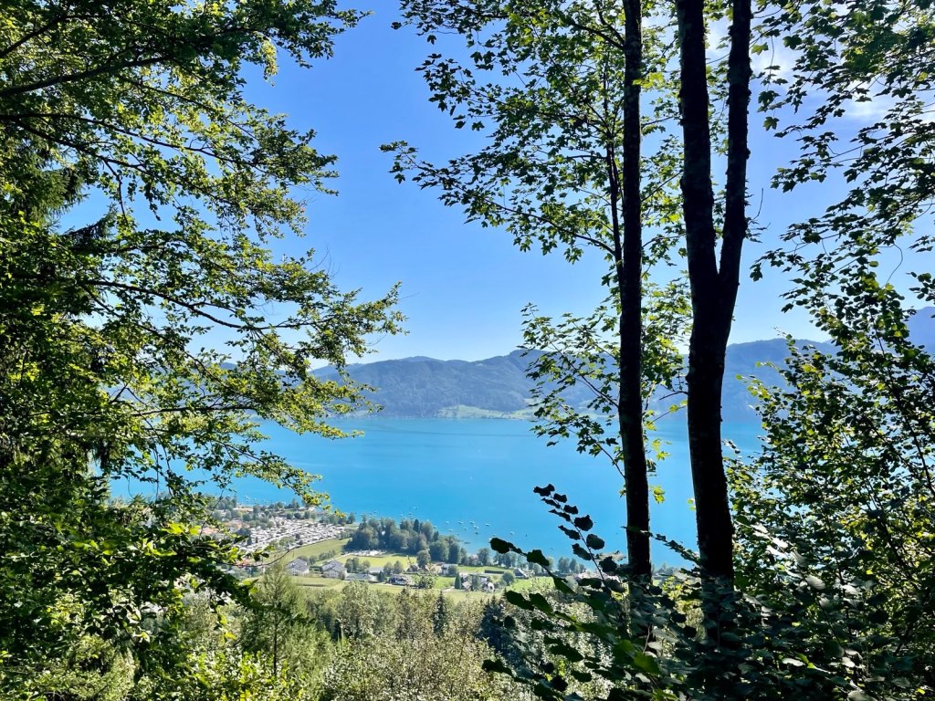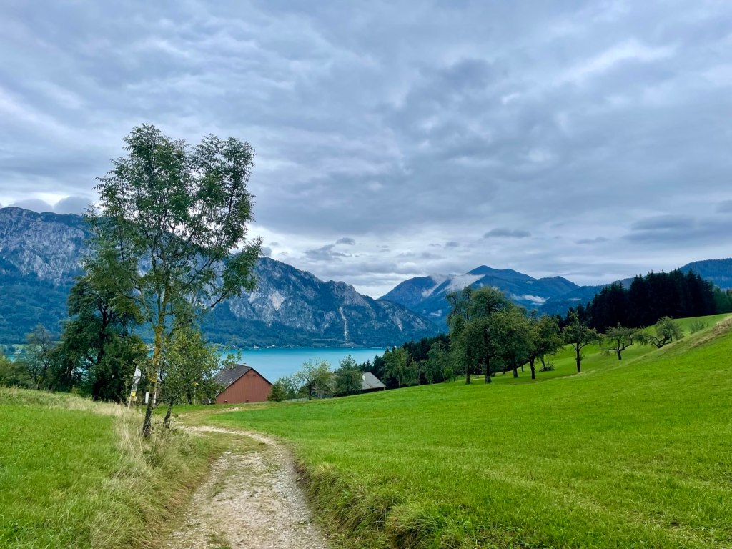 Unsere Unterkunft beim diesjährigen Urlaub liegt auf der gegenüberliegenden Seite in dem kleinen idyllischen Örtchen Buchenort am Westufer des Attersees. Auch hier haben wir einen direkten Seezugang mit Bootshaus und Steg und der besonderen Annehmlichkeit eines Tunnels, der den Badestrand mit der Unterkunft verbindet, sodass wir nicht über die doch viel befahrene Straße müssen. Es ist Anfang September und der See ist aufgrund des langen und heißen Sommers ungewöhnlich warm mit ca. 23 Grad. Das Höllengebirge liegt jetzt vor uns, hinter uns ist es sanft hügelig. Wir genießen nicht nur herrliches Badewetter, sondern wir machen ein paar wunderschöne Wanderungen und erkunden die Gegend, je nach Wetter, das uns so ziemlich alles bietet – aber etwas anderes erwarten wir auch nicht vom Salzkammergut. Der Attersee ist ja nicht der einzige See hier, unsere Ausflüge erstrecken sich auf den nahe gelegenen Mondsee, den Traunsee und den Wolfgangsee. Das sind die größeren Seen hier, aber wir entdecken noch andere, kleinere Seen die nicht so bekannt sind, aber auf jeden Fall sehens und erwandernswert.