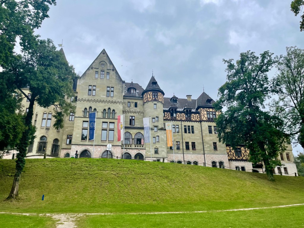 Inzwischen hat es auch hier zu regnen begonnen und wir fahren mit dem Auto zum ehemaligen Schloss Cumberland (in Gmunden), einem beeindruckenden historischen Bauwerk, das eine interessante Geschichte aufweist und eng mit der österreichischen Monarchie verbunden ist. Das Besondere an diesem imposanten Bauwerk mit den turmartigen Aufbauten ist, dass es im neugotischen Tudorstil erbaut wurde und zwar vom Kronprinzen von Hannover und 3. Duke of Cumberland. Heute wird das Schloss als Pflegeheim genützt und ist für die Öffentlichkeit nicht zugänglich, aber man kann durch den weitläufigen wunderschönen Park spazieren.
