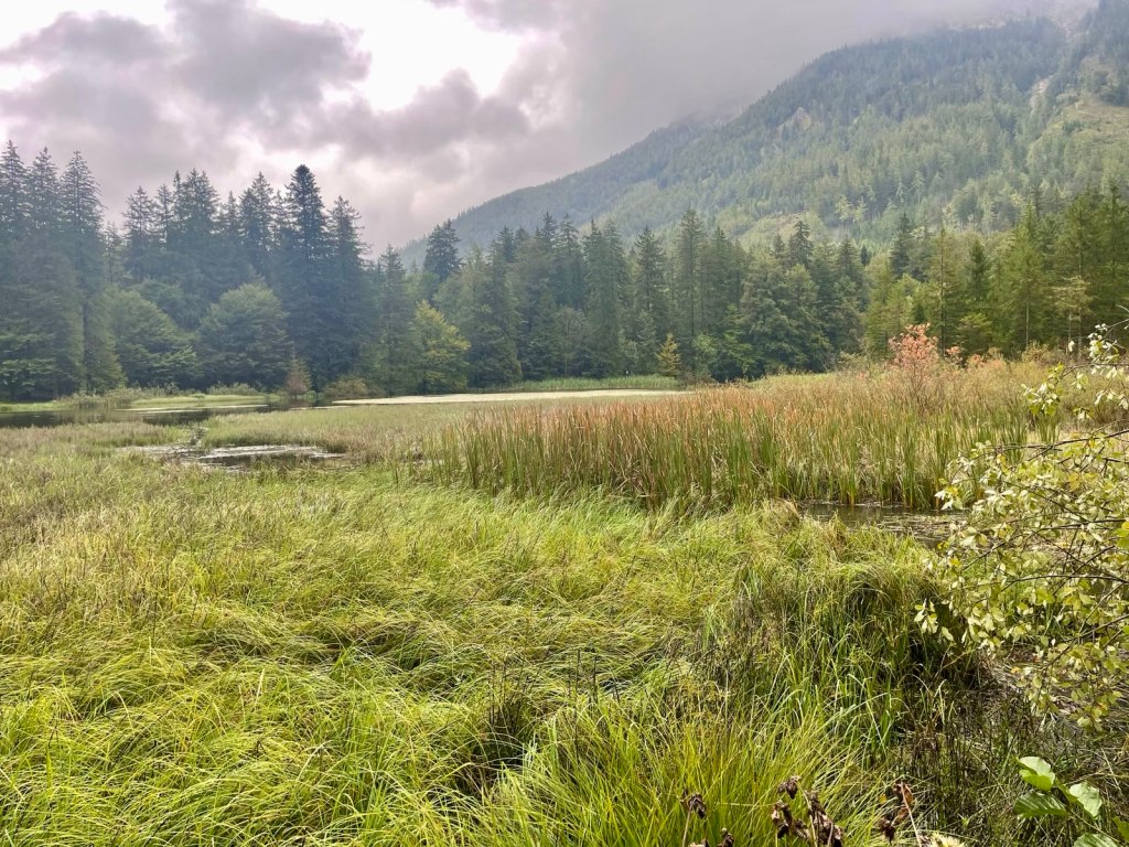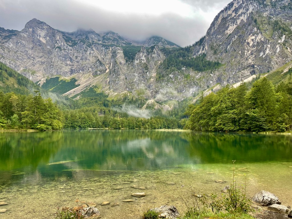 Da wir uns nach diesem Stadt- und Kulturspaziergang noch etwas bewegen wollen, fahren wir trotz heftigen Regens zu den Langbathseen, die oberhalb von Ebensee liegen, am anderen Ende des Traunsees. Die Straße erinnert mich an Montenegro – schmal und kurvig, aber wenigstens sind keine anderen Autos unterwegs. Das Wetter meint es gut mit uns – als wir oben angekommen noch überlegen ob wir trotz Regen die zweistündige Umrundung der beiden Seen wagen sollen hört es auf zu regnen und so stapfen wir fröhlich los. Eine sehr gute Entscheidung und ein Höhepunkt unseres Urlaubs. Die Langbathseen gehören zu den reinsten Seen in Österreich, was durch ihre Lage in einem nahezu unberührten Berggebiet und den Schutz als Naturdenkmal unterstützt wird. Das Wasser der Seen ist besonders klar und bietet bei gutem Wetter beeindruckende Spiegelungen der umliegenden Berge. Die Seen werden von unterirdischen Quellen gespeist und haben daher eine gleichmäßige Temperatur. Das Wasser ist relativ kalt, was aber typisch für Gebirgsseen ist. Wir sind besonders vom hinteren Langbathsee verzaubert. So etwas Schönes haben wir schon lange nicht gesehen und so stehen wir und staunen nur ob dieser beeindruckenden Kulisse. Seht selber: