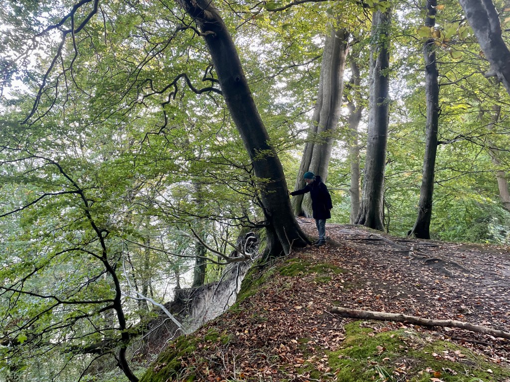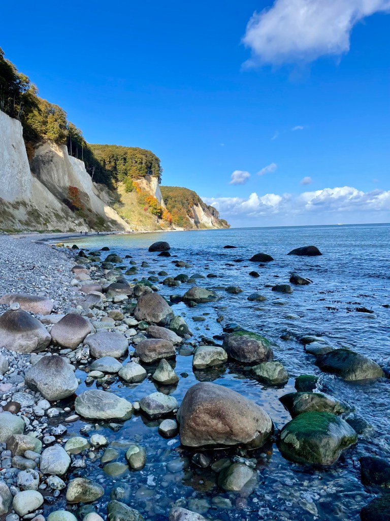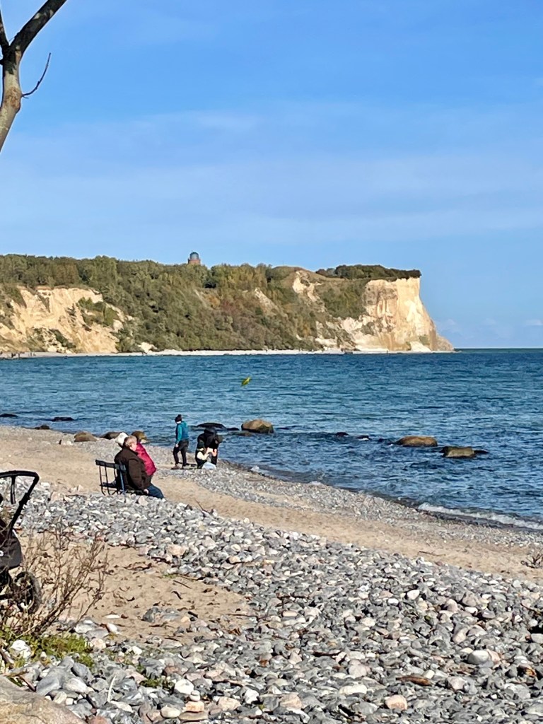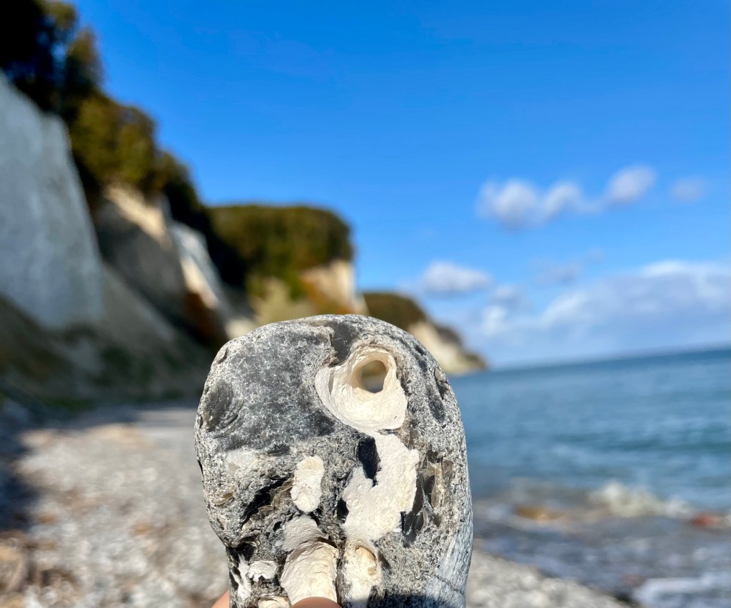 Wir wandern vom großen Parkplatz nahe Lohme bis zum Nationalpark-Zentrum Königstuhl und dann weiter den Hochuferweg Richtung Sassnitz bis zum Wasserfall Kieler Bach. Hier am Strand sammeln wir jede Menge Hühnergötter bevor wir uns wieder auf den Rückweg machen. Hühnergötter sind Steine mit einem natürlichen Loch, die man besonders häufig an den Küsten der Ostsee und Nordsee findet. Es handelt sich meist um Feuersteine, die durch den langen Einfluss von Wasser und mechanischer Einwirkung – wie etwa Reibung mit Sand und anderen Steinen – ein Loch in ihrer Mitte entwickelt haben. Hühnergötter werden oft als Glücksbringer betrachtet und haben in verschiedenen Kulturen und Regionen eine lange Tradition als Talismane.