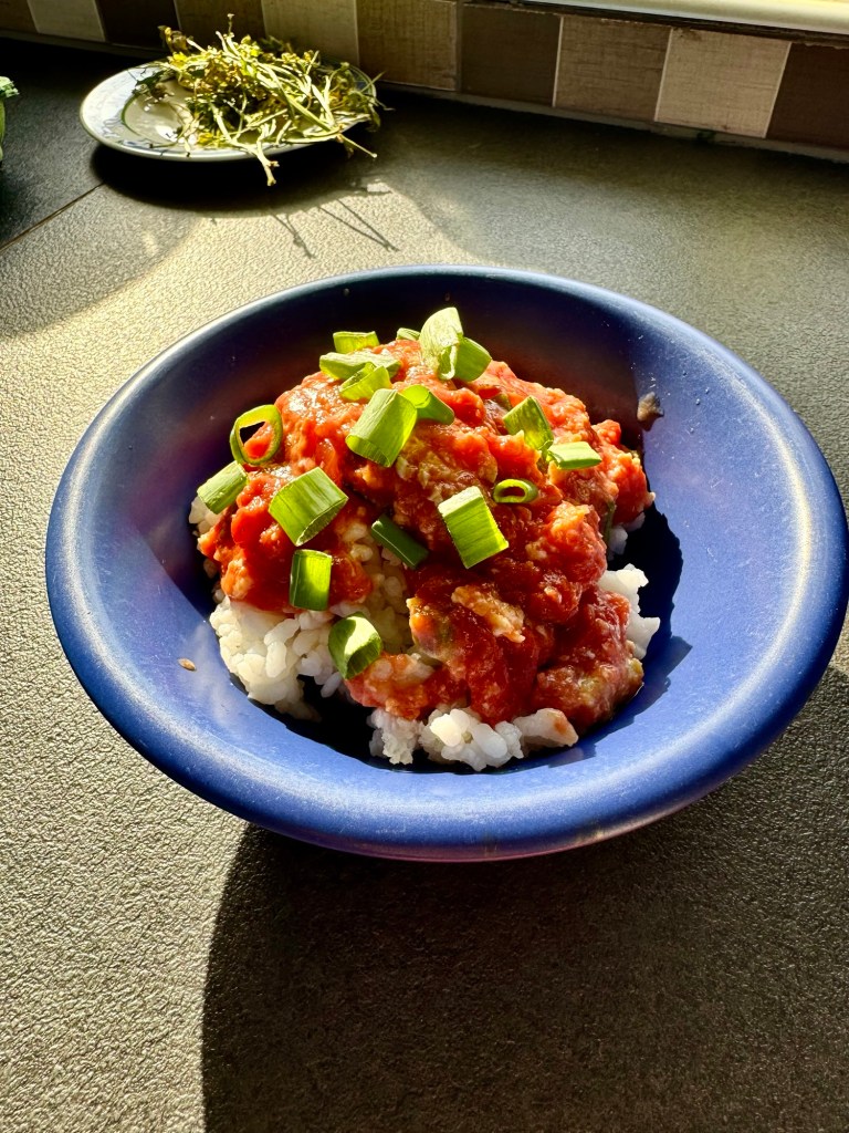 Die Menge ist für etwa zwei, eventuell drei Personen. Eine Tasse Reis kochen. In einer Pfanne Frühlingszwiebeln anbraten und dann fünf verquirrlte Eier hinzugeben. Am Ende Dosentomaten hinzugeben und mit Salz abschmecken. Gemeinsam mit dem Reis servieren und mit frischen Frühlingszwiebeln bestreuen. Wer es gern etwas schärfer mag, kann noch etwas Siracha Soße hinzufügen.